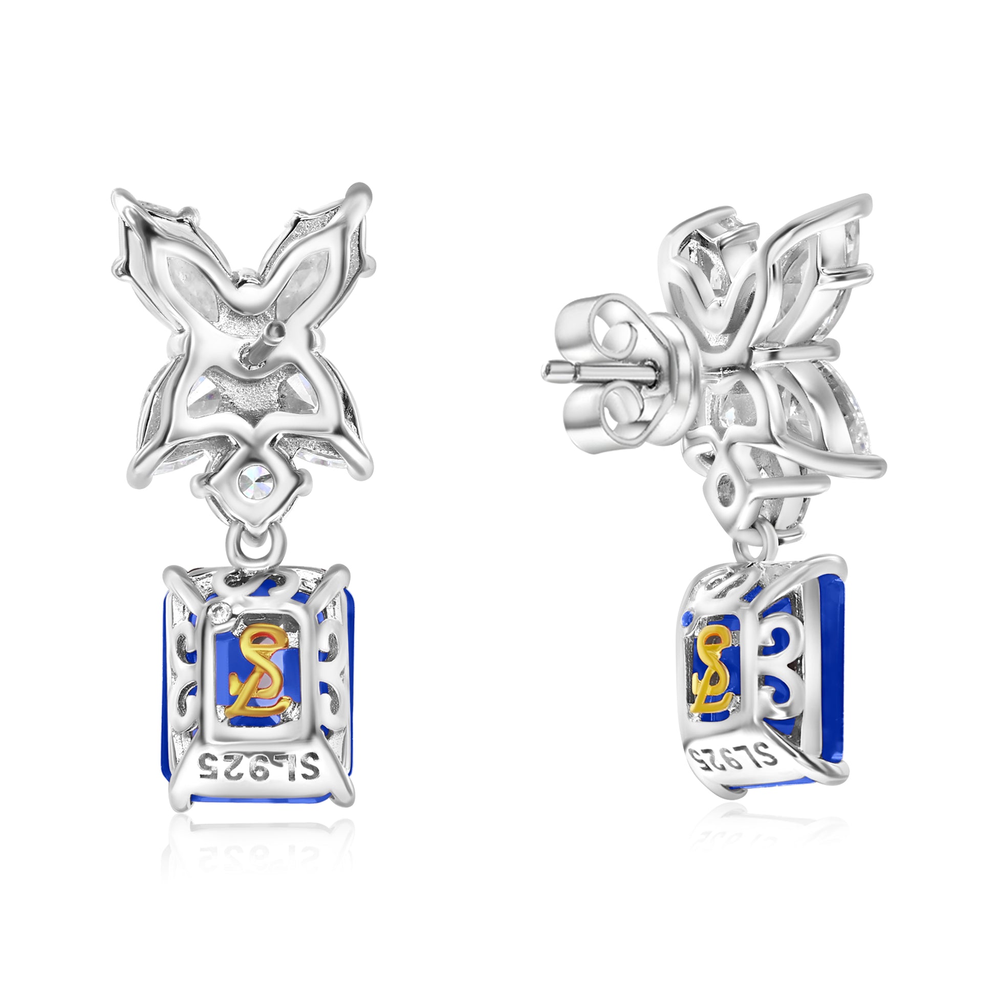 Opulently detailed, these earrings are nothing short of breathtaking. These beautiful earrings from the gala collection, features a large emerald cut blue cubic zirconia and white marquise cut, and round cut cubic zirconia's that are made into a gorgeous cluster design, set in white sterling silver. These stunning earrings will embellish and enrich every single outfit they will be matched to! These earrings are designed by Suzy Levian with a message. By creating jewelry that is beautiful inside and out, Suzy Levian's message is revealed through a hidden pink cubic-zirconia set in the back of both earrings to empower women to discover their inner strength, power and beauty. Back fancy gallery with a sterling silver two-tone setting, highlighting Suzy Levian's SL logo. These earrings secure with a lever back closure for a snug-tight fit. 'Together we can inspire the world to appreciate the diamond in ourselves.' - Suzy Levian