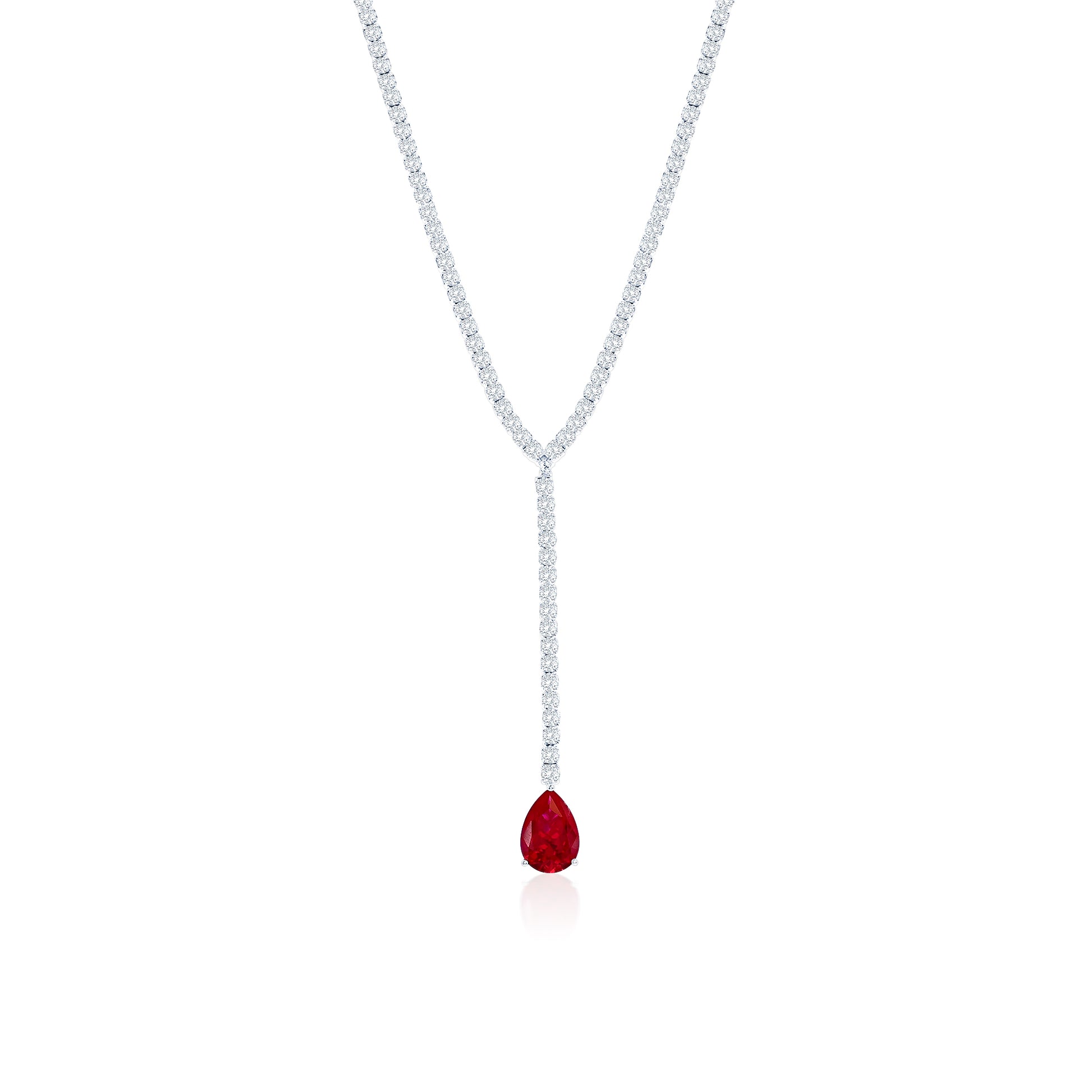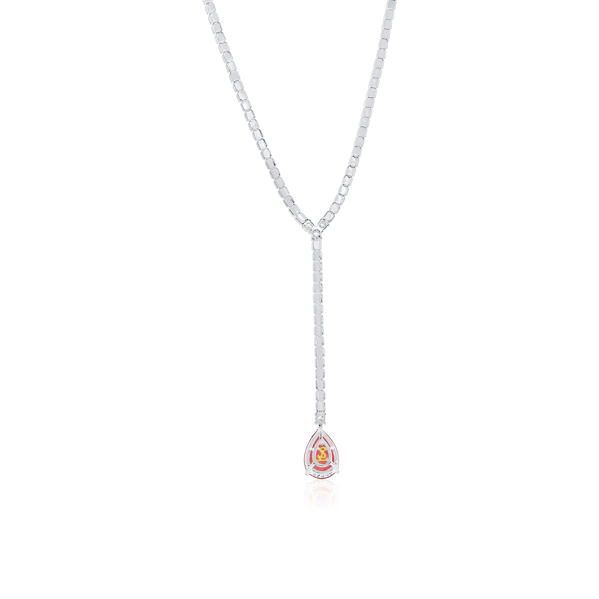 The timeless elegance of this gala collection lariat tennis necklace converges with a large beautiful red pear shape cubic zirconia, and white cut cubic zirconia gemstones to create a breathtakingly elegant design. Crafted in sterling silver an estimated 166 glistering white round cut cubic zirconia gemstone embezzle your neck with a a large pear shape red cubic zirconia estimated at 5.41cttw. This timeless, royal design is finished with an 18k yellow gold SL logo and a Suzy Levian Secret pink cubic zirconia in the back gallery. This necklace is secured with a safety lock closure to ensure a tight fit. This necklace is designed to encourage women to embrace their own hidden inner beauty as well!