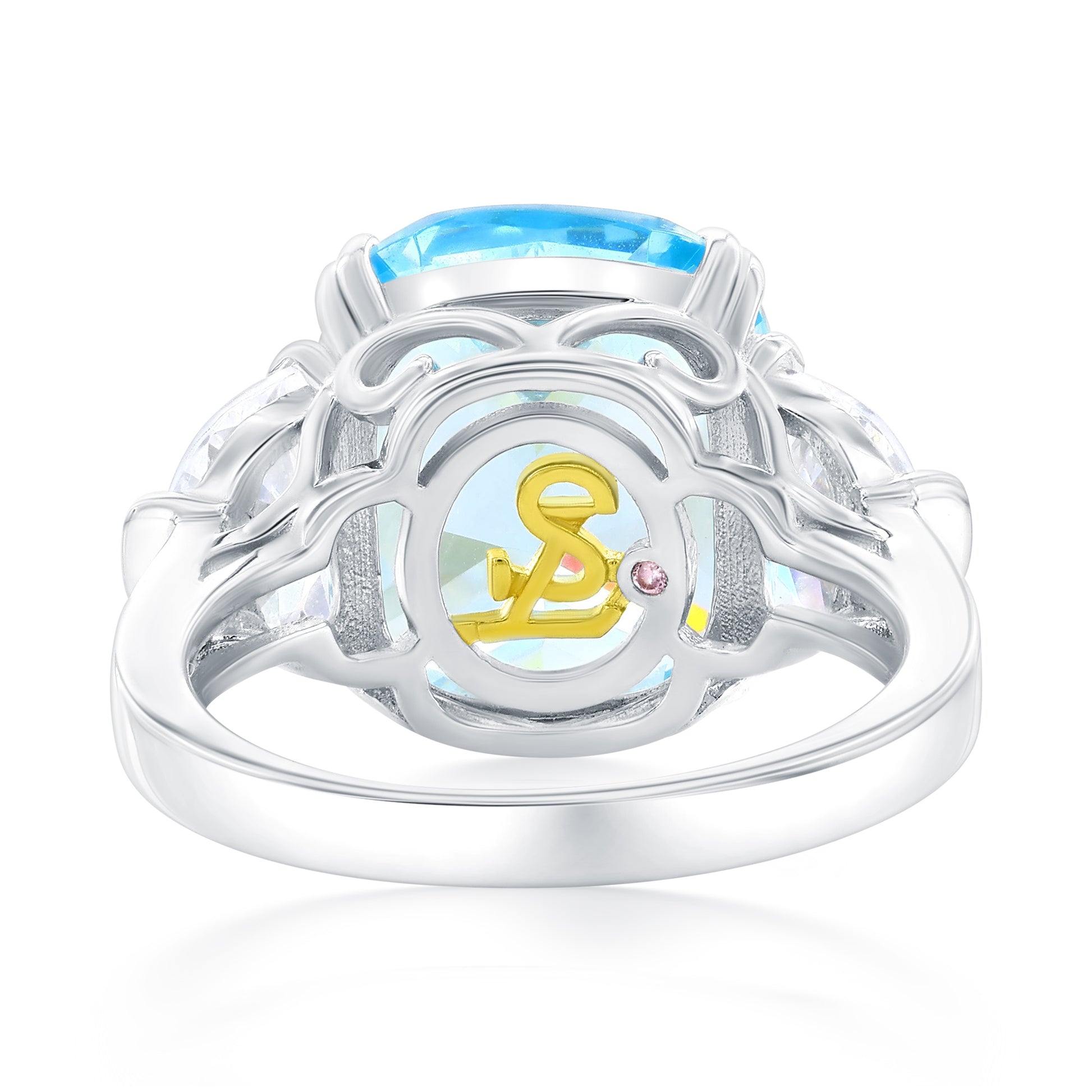 From the day he bends down on one knee through your 50th wedding anniversary and beyond, the sparkle in this gemstone ring will rival the sparkle in his eyes when he looks at you. Made of 925 sterling silver, this fabulous ring from the gala collection features an elongated firework cushion cut aqua cubic zirconia center stone, sided by two firework half moon white cubic zirconia's, continued with smaller cubic zirconia's going half way down the band. The beautiful firework aqua cubic zirconia has a double claw prong setting, giving the ring a unique design. Every single ring is man made, making it a unique masterpiece. The Suzy Levian brand guarantees the use of only the finest and highest quality materials and confirm that each and every item has been subjected to the most exacting quality control. This ring is designed by Suzy Levian with a message. By creating jewelry that is beautiful inside and out, Suzy Levian's message is revealed through a hidden pink cubic zirconia set in the shank of this ring to empower women to discover their inner strength, power and beauty. This ring has a two-tone plated under-gallery, highlighting it's Suzy Levian logo. 'Together we can inspire the world to appreciate the diamond in ourselves.' - Suzy Levian