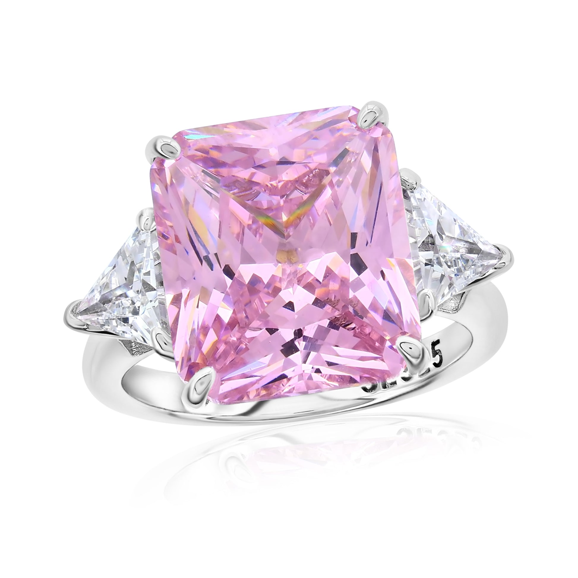 From the day he bends down on one knee through your 50th wedding anniversary and beyond, the sparkle in this gemstone ring will rival the sparkle in his eyes when he looks at you. Made of 925 sterling silver, this fabulous ring from the gala collection features a large firework emerald cut pink cubic zirconia center stone, sided by two trillion cut white cubic zirconia's. The beautiful pink emerald cut cubic zirconia has a prong setting, giving the ring a unique design. Every single ring is man made, making it a unique masterpiece. The Suzy Levian brand guarantees the use of only the finest and highest quality materials and confirm that each and every item has been subjected to the most exacting quality control. This ring is designed by Suzy Levian with a message. By creating jewelry that is beautiful inside and out, Suzy Levian's message is revealed through a hidden pink cubic zirconia set in the shank of this ring to empower women to discover their inner strength, power and beauty. This ring has a two-tone plated under-gallery, highlighting it's Suzy Levian logo. 'Together we can inspire the world to appreciate the diamond in ourselves.' - Suzy Levian