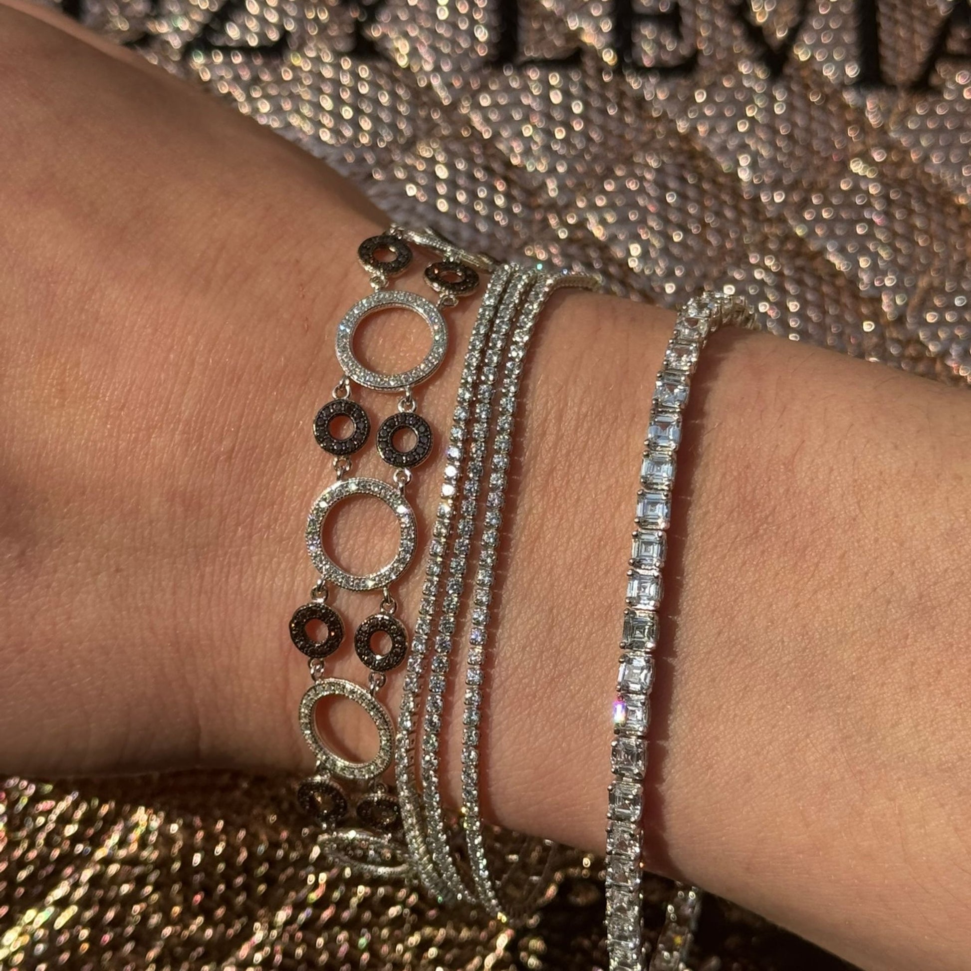 This tasty bracelet is filled with rich color, depth and design. Brown pave cubic zirconia gemstones create smaller circles that link to large white pave cubic zirconia circles, creating a circular pattern to give design and style all around your wrist. A lobster claw clasp perfectly secures this bracelet to make sure that your bracelet stays securely on your wrist no matter how much your dancing hands wave up and down in the cheerful air. Each Suzy Levian creation is handcrafted and made of 925 sterling silver, high quality and carefully selected cubic zirconia, providing our customers with the finest accessories.