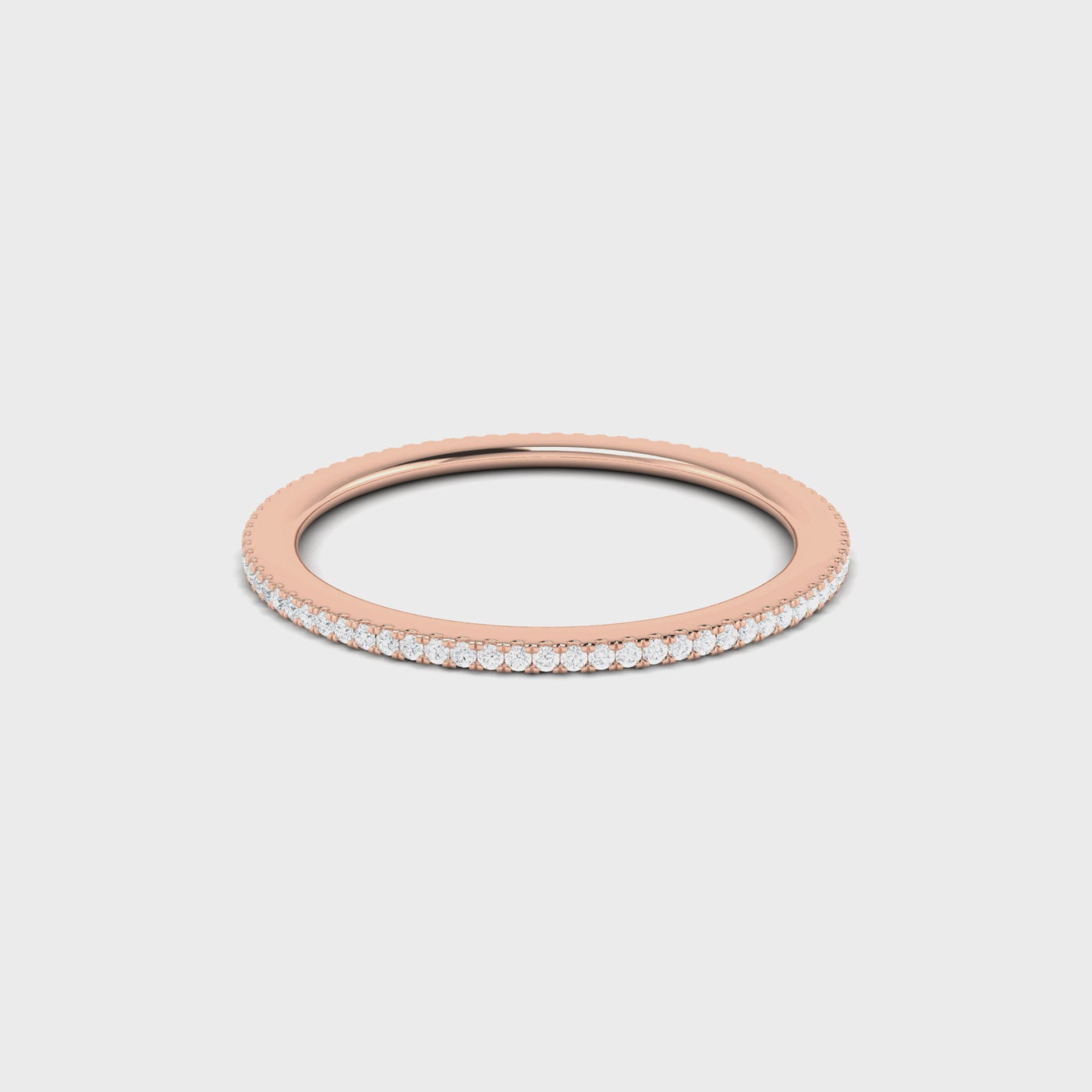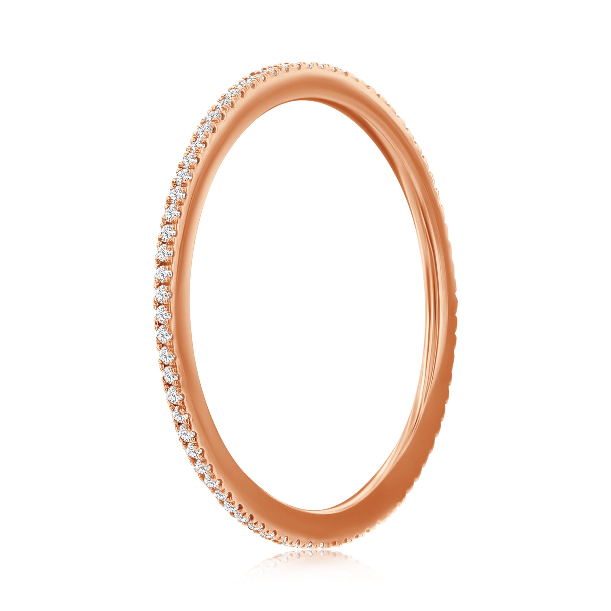 Radiant round-cut natural white diamonds sparkle as they dazzle this classy ring. Designed by Suzy Levian, this 14k rose gold eternity ring features, .14cttw of white diamonds pave set in a single row with high polish finish. Beautiful on it's own or perfectly stackable with another Suzy Levian design, this flawless, elegant design comes with endless fashion possibilities. It's the perfect gift for any occasion. This ring is eye-catching on its own or can also be worn with your engagement ring. Remind yourself of your love and commitment every time you look at this elegant ring. This ring packs an impressive amount of elegance into its sturdy prong settings. The low profile keeps your gems safe and prevents snagging on fabrics. The Ring dimensions are; 20mm x 1mm.