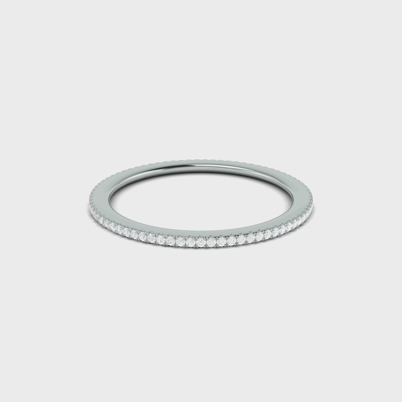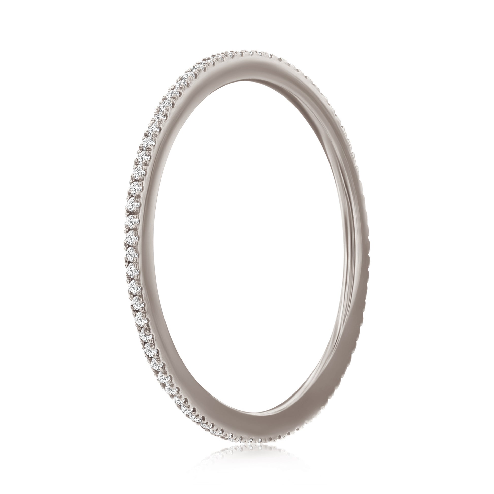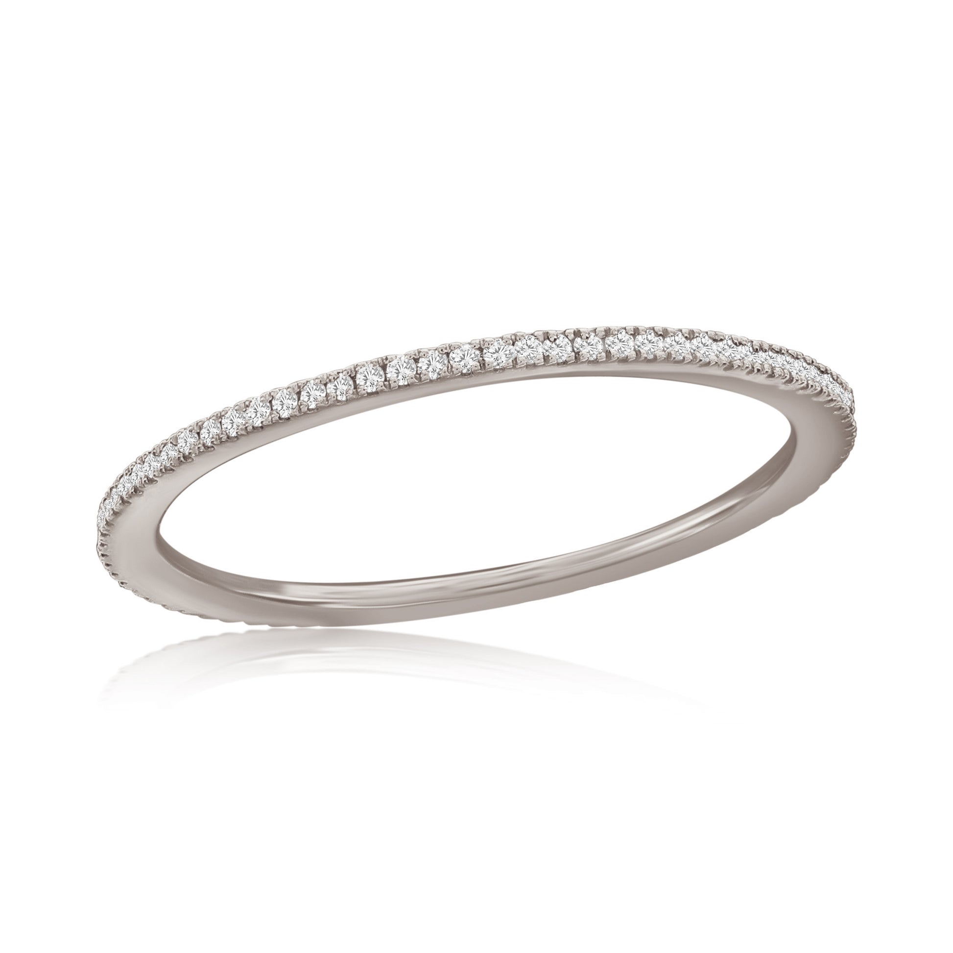 Radiant round-cut natural white diamonds sparkle as they dazzle this classy ring. Designed by Suzy Levian, this 14k white gold eternity ring features, .14cttw of white diamonds pave set in a single row with high polish finish. Beautiful on it's own or perfectly stackable with another Suzy Levian design, this flawless, elegant design comes with endless fashion possibilities. It's the perfect gift for any occasion. This ring is eye-catching on its own or can also be worn with your engagement ring. Remind yourself of your love and commitment every time you look at this elegant ring. This ring packs an impressive amount of elegance into its sturdy prong settings. The low profile keeps your gems safe and prevents snagging on fabrics. The Ring dimensions are; 20mm x 1mm.