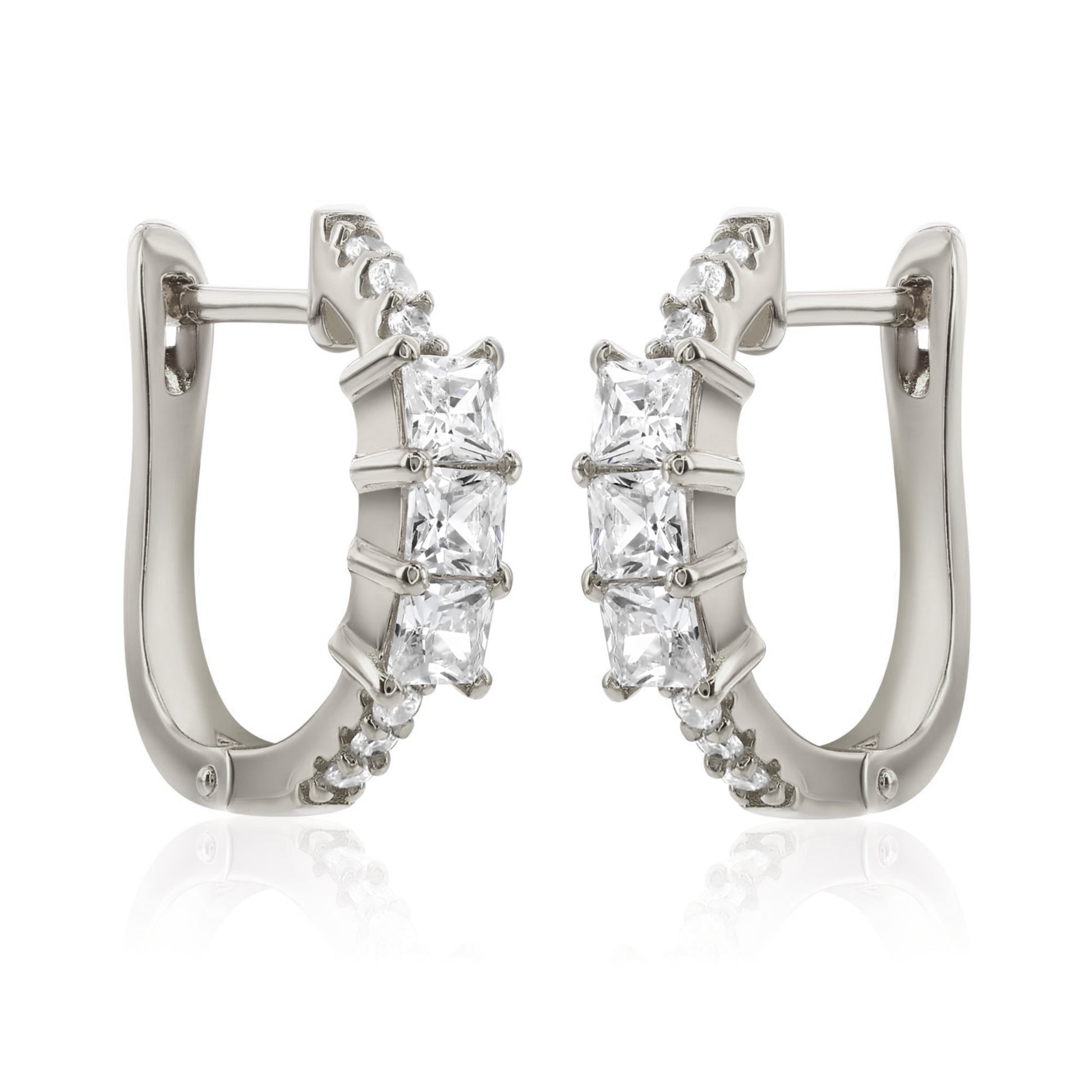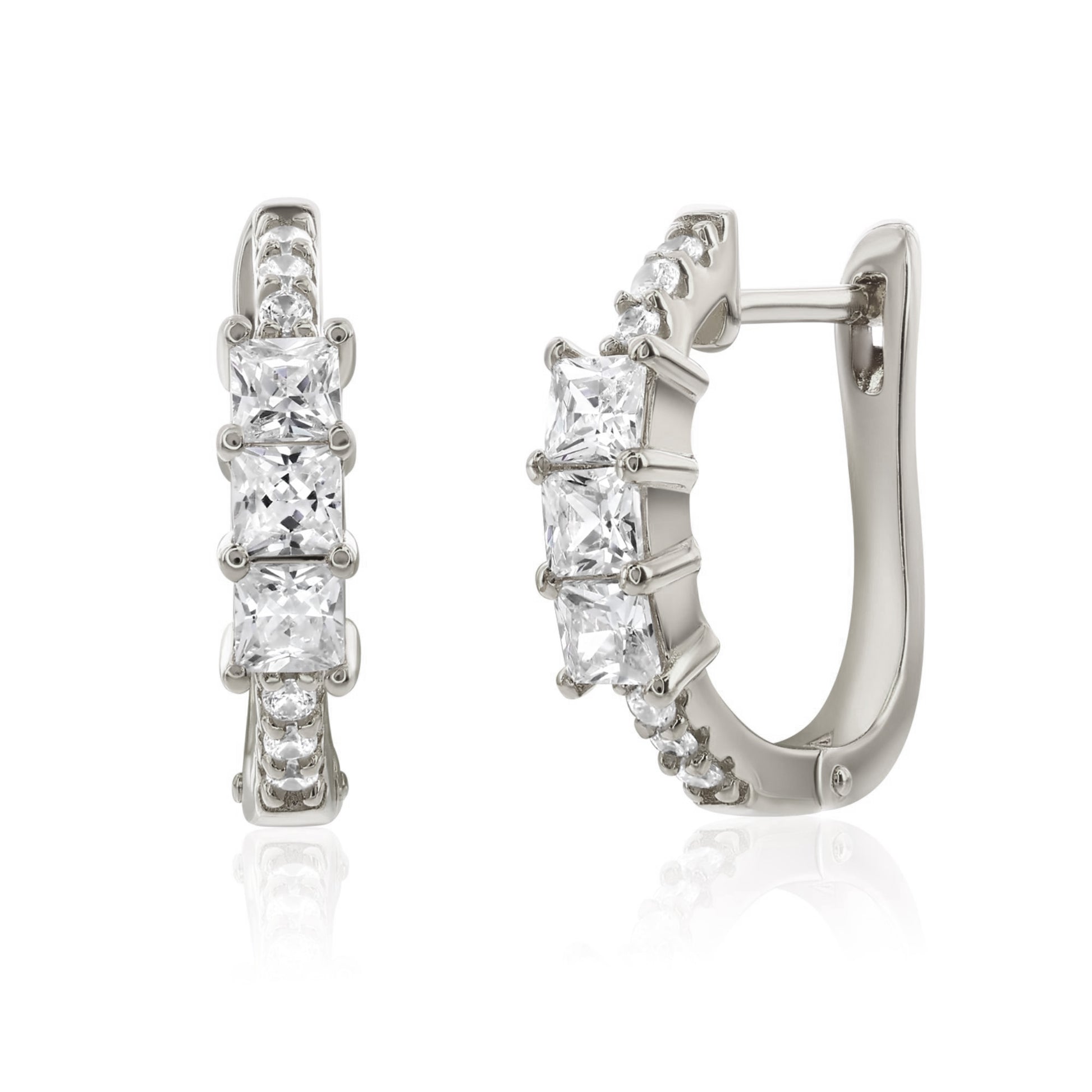 Suzy Levian White Sterling Silver & White Cubic Zirconia Pave Princess Cut Huggie Hoop Earrings