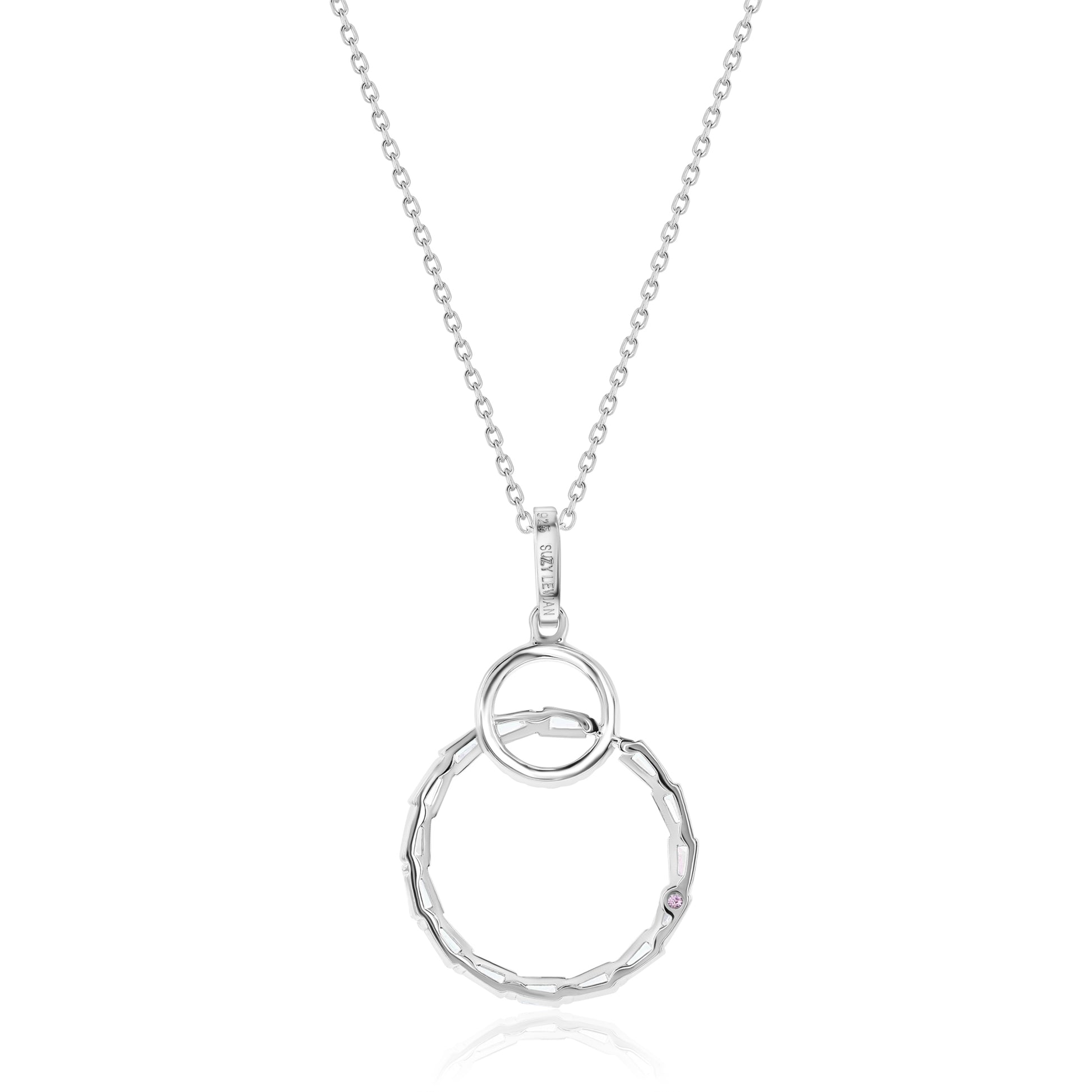 This adorable Suzy Levian interlocking double circle pendant is the perfect size for someone who wants to wear the trendy circle look with a more conservative class and flair! This beautiful Suzy Levian pendant features a smaller pave-set circle interlocked with a larger circle of trapezoid baguettes white cubic zirconia's hanging from a bail of pave set cubic zirconia's. Each pendant comes with an 18" sterling silver cable chain and is secured with a spring ring closure. This pendant is designed by Suzy Levian with a message. By creating jewelry that is beautiful inside and out, Suzy Levian's message is revealed through a hidden stone set inside the shank of this pendant to empower women to discover their inner strength, power and beauty. 'Together we can inspire the world to appreciate the diamond in ourselves.' - Suzy Levian