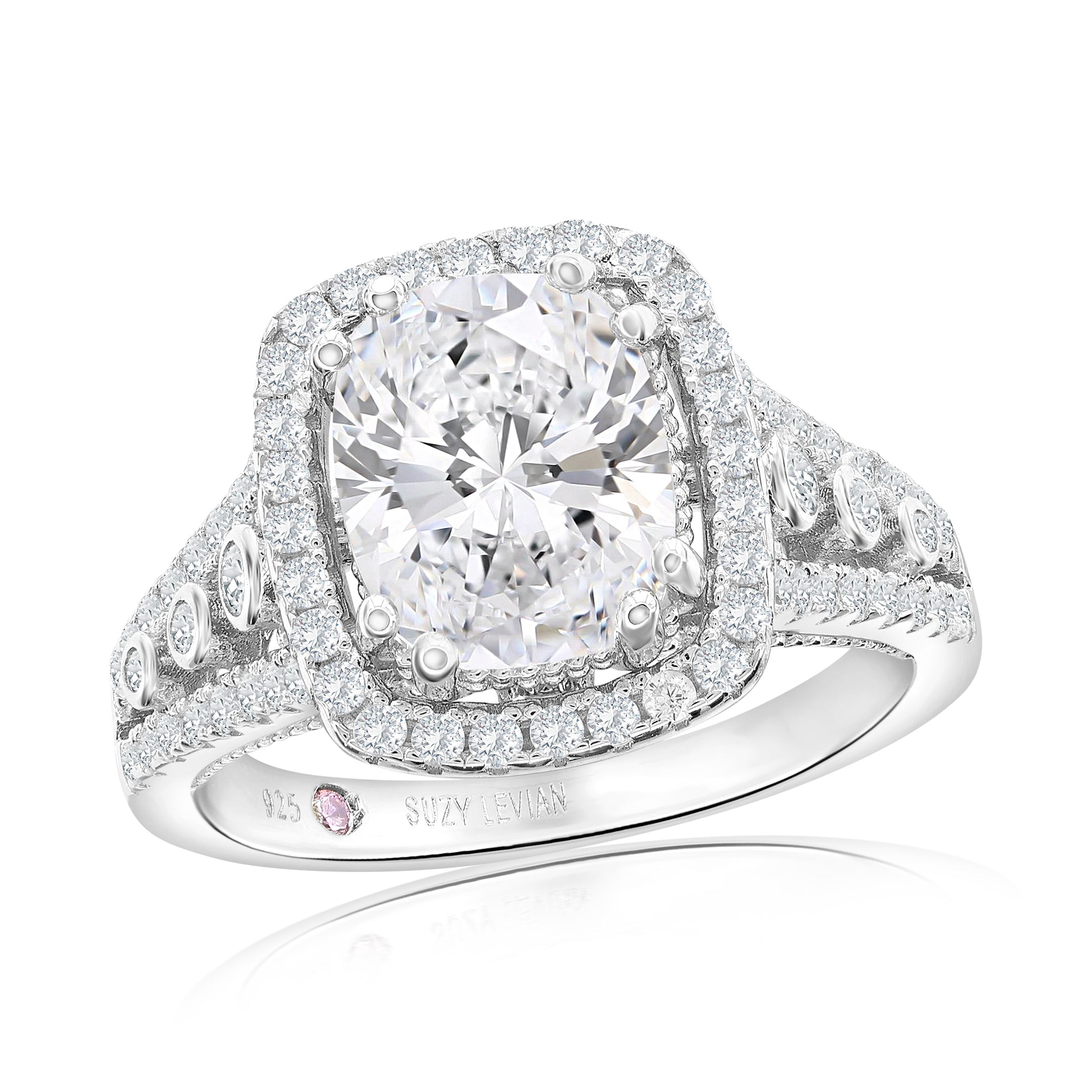 This delicious engagement ring features an elongated cushion-cut white cubic zirconia center stone, prong-set in a pave white cubic zirconia halo. Crafted of white sterling silver, This ring features a combined pattern of white pave cubic zirconia and detailed metal work all across the band to create a royal-inspired design for the sporty girl. With so much gorgeous detail put into every angle of this ring, this beautiful ring is complete with Brown cubic zirconia bezel-set between rows on pave white cubic zirconia. As well as being designed through breathtaking details on the outside, this ring is designed by Suzy Levian with a message to share. By creating jewelry that is beautiful inside and out, Suzy Levian's message is revealed through a hidden stone set in the shank of this ring meant to empower women to discover the inner strength, power and beauty that hides within themselves.