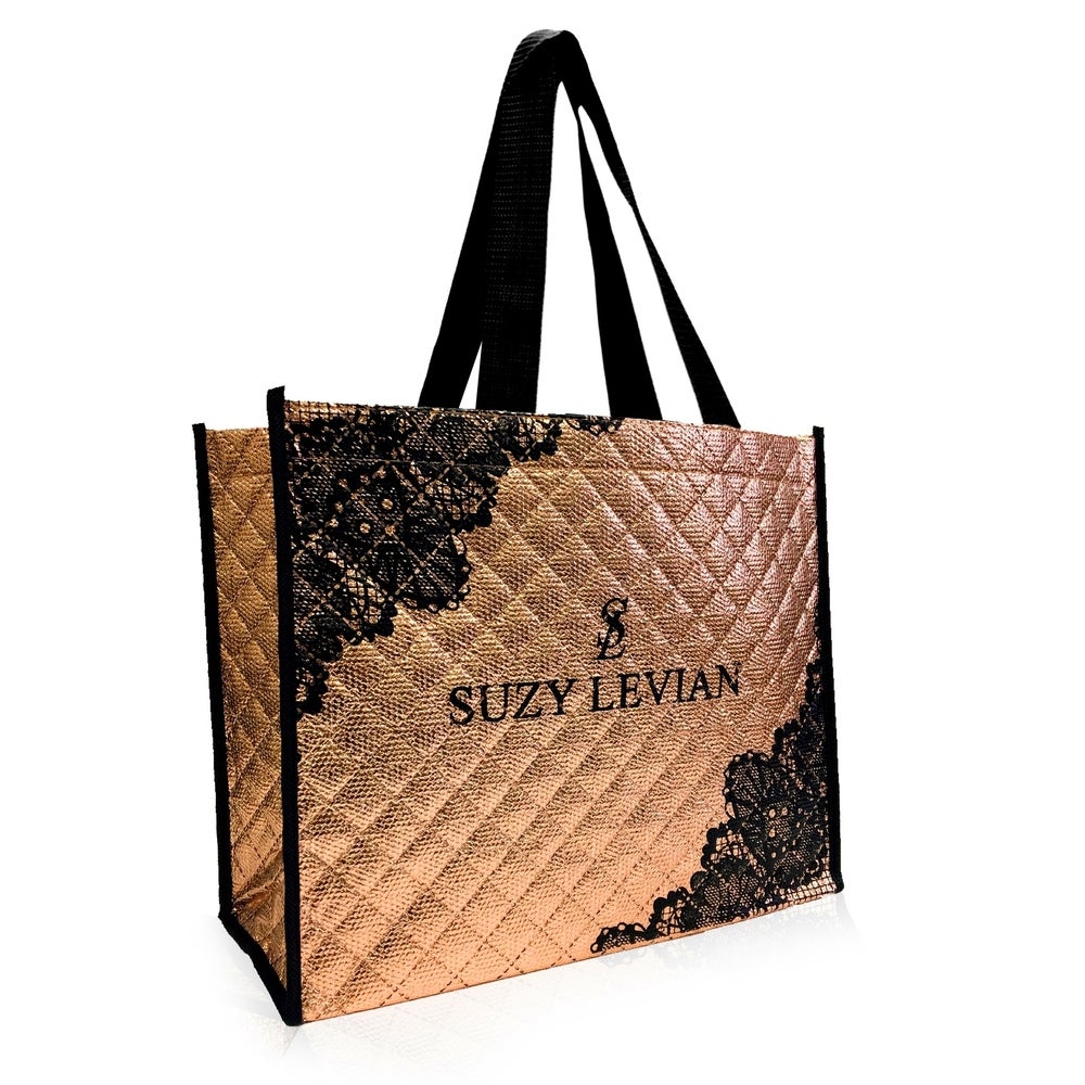 The shopping tote bag just got an upgrade with this fabulous quilted tote. From needing to carry an extra pair of shoes, or some documents, as well as lunch, this Suzy Levian carryall provides all the storage of a regular grocery tote with a designer quality, making it look more like a fashion accessory than a shopping necessity. The design features a beautiful lacework printed over a quilted shiny rose gold backdrop. The Suzy Levian name sits on both sides of this bag, making sure the world knows you are carrying a top of the line, high end quality designer bag. The tote is designed with a foldable bottom base to stay open and to hold its shape for quick loading/unloading. This bag is made to use and reuse thanks to it's well constructed material, bottom base, and strong reinforced handles. The space saving design allows the bag to fold flat making it easy to take along in your purse or keep it in your car. Measures: 12.5" length, 10' height, 4.7" dept.