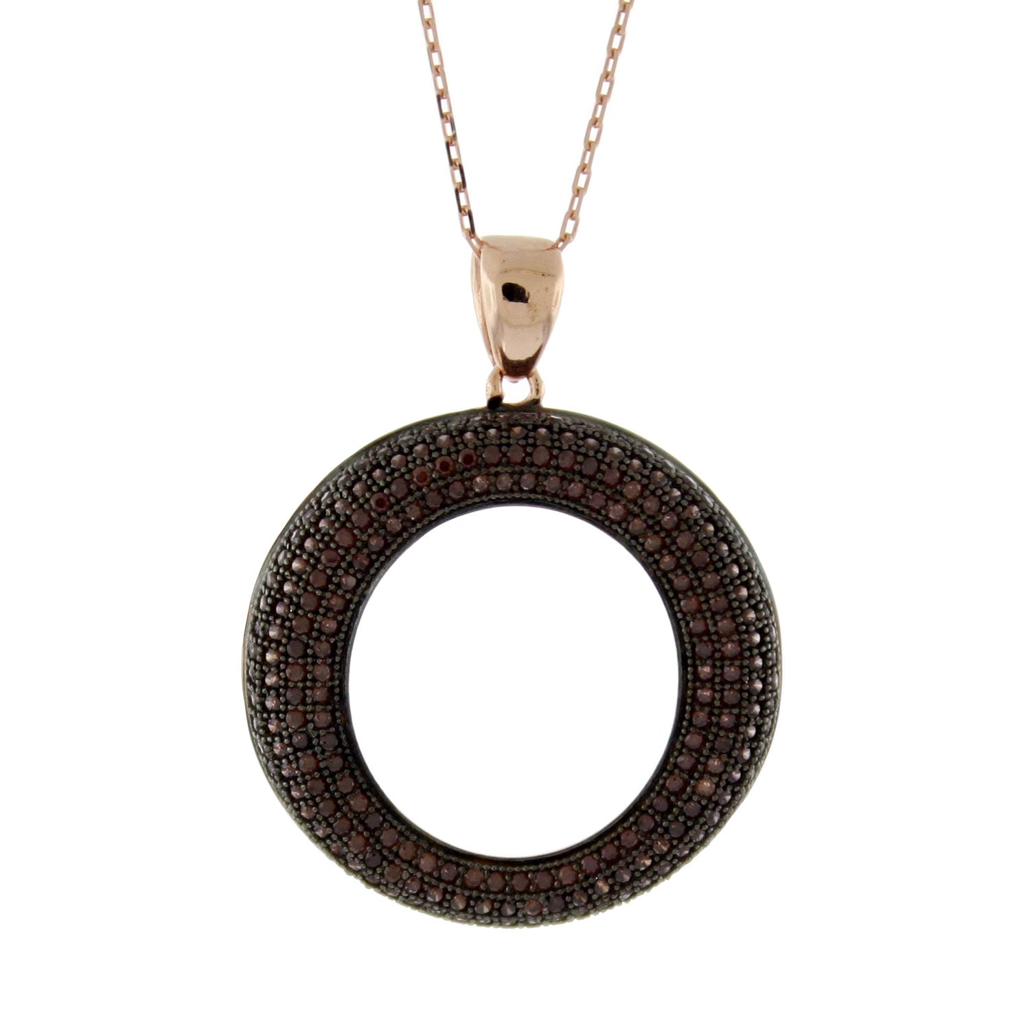 Many round-cut cubic zirconia, in either Brown or white, sit in a pave setting in a circle pendant on a sterling silver chain on this stunning necklace. A high polish finish completes the look.