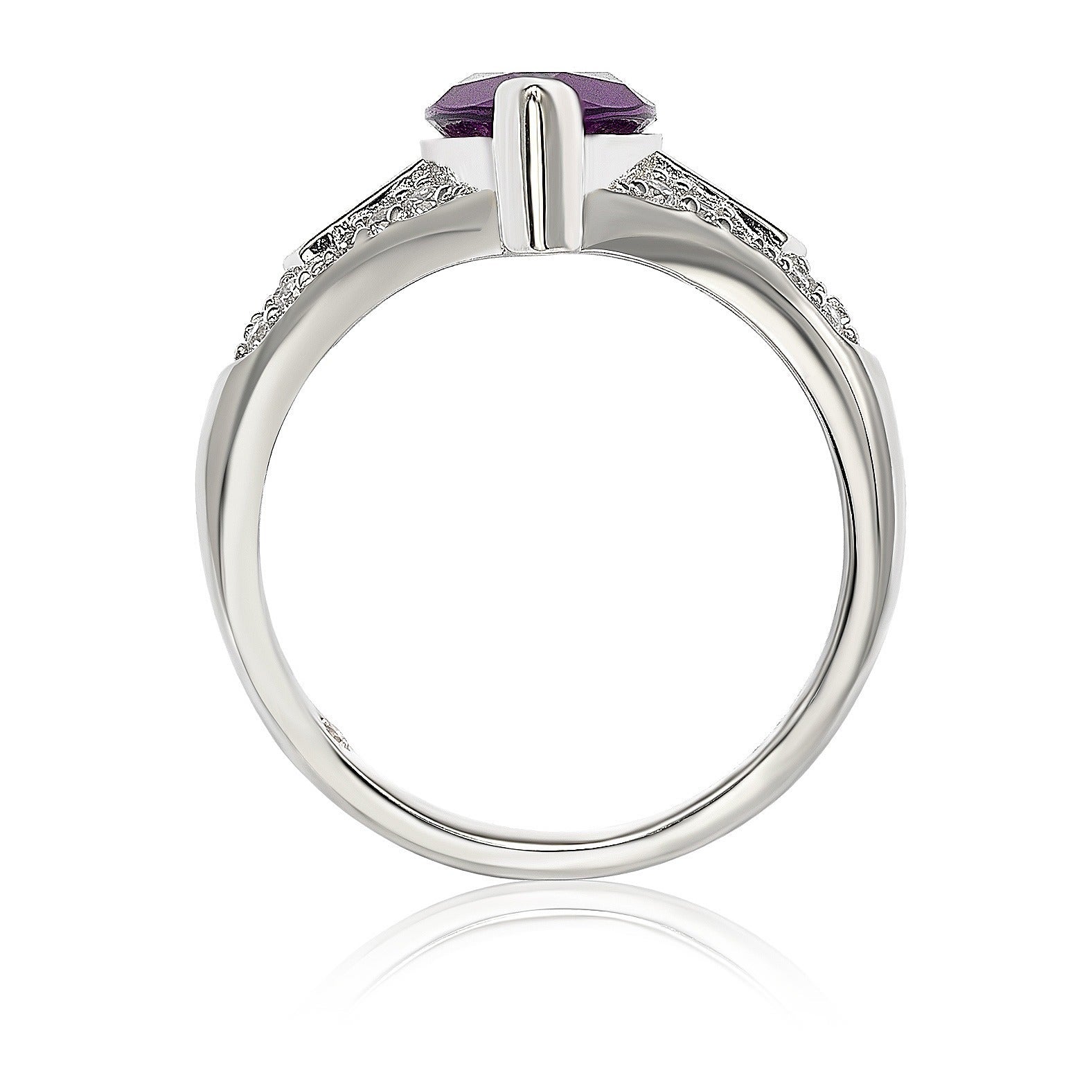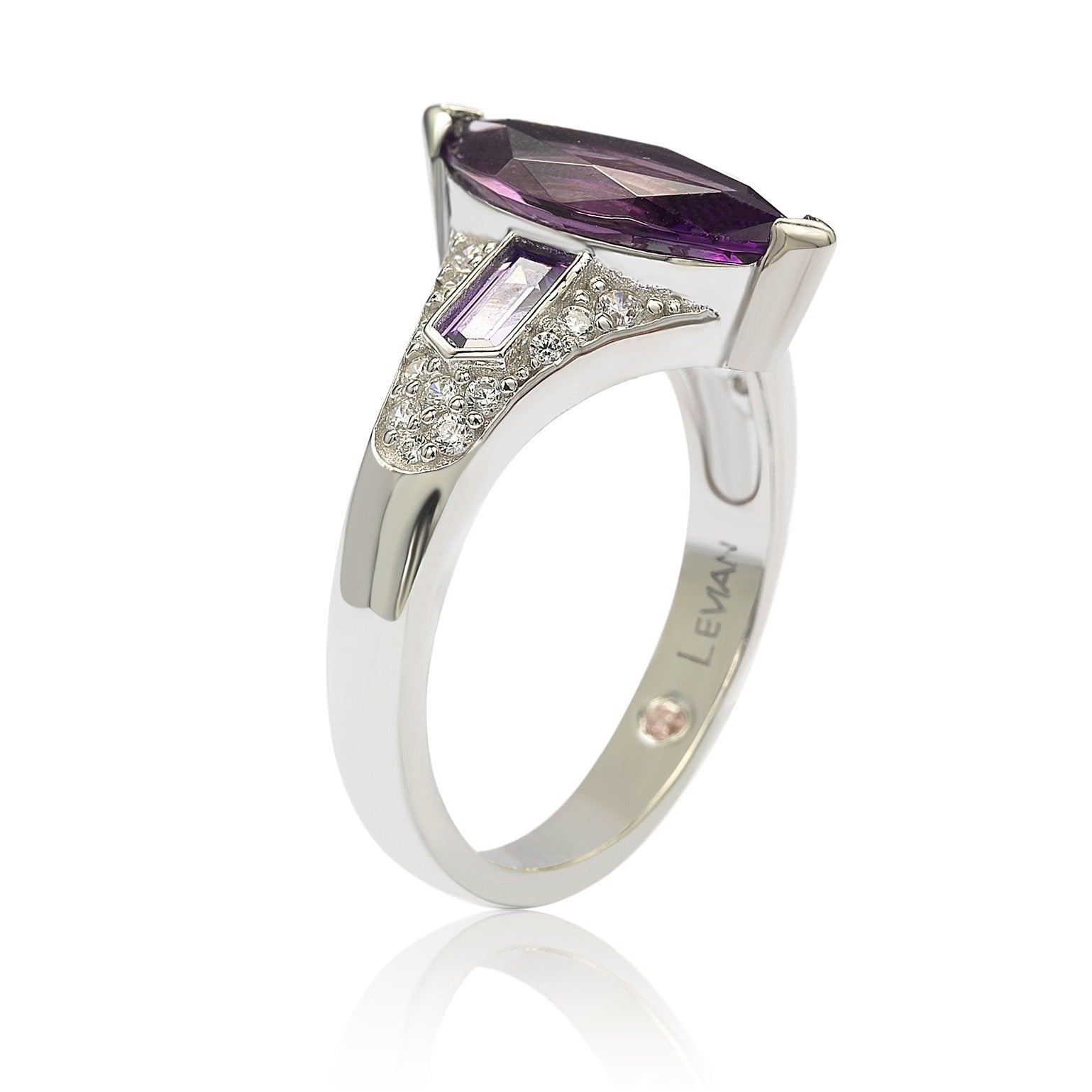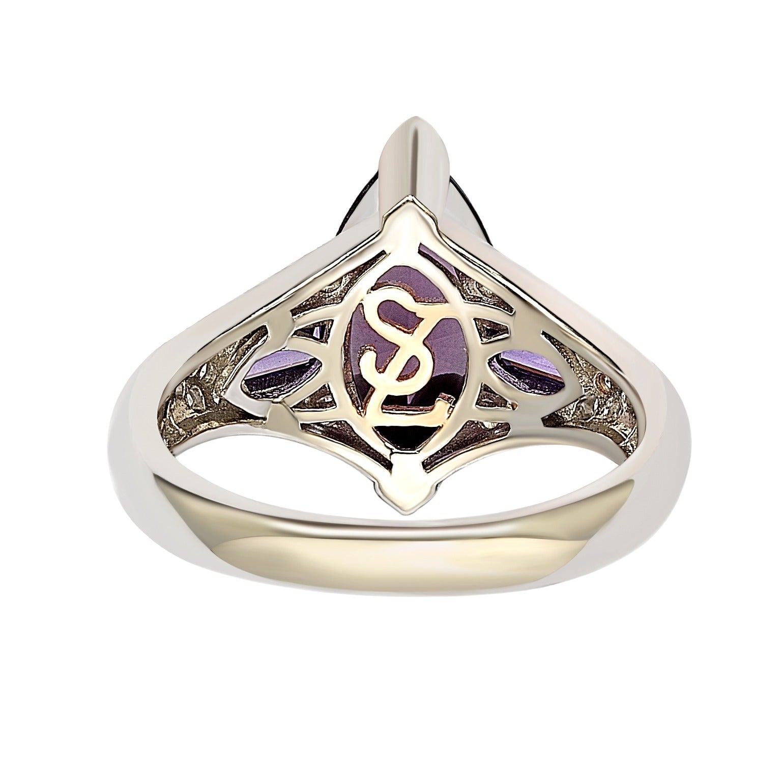 This Suzy Levian ring features a gorgeous marquise cut purple cubic zirconia center with 2 bullet shaped purple stones on the sides with white stones in a micro pave setting, This bridal ring is hand set in high polished sterling silver. This ring is designed by Suzy Levian with a message. By creating jewelry that is beautiful inside and out, Suzy Levian's message is revealed through a hidden stone set inside the shank of this ring to empower women to discover their inner strength, power and beauty. This ring has a closed under-gallery for comfort fit with a two tone plating, highlighting Suzy Levian's SL logo.