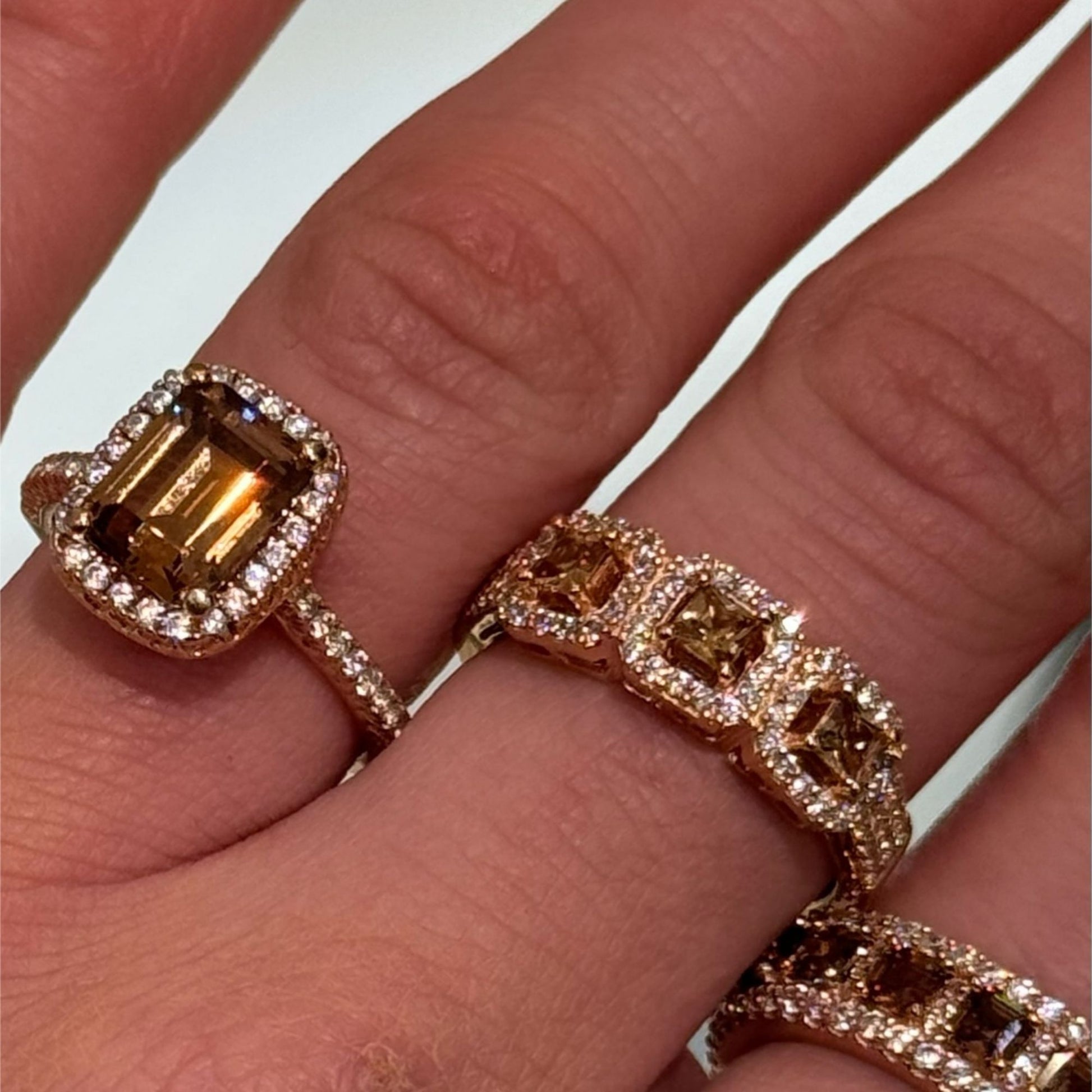 It's a taste you can see! Add a tasteful yet regal element to your style. Inspired by Princess Diana, this sophisticated ring features an emerald-cut Brown cubic zirconia center stone with a pave halo of round cut white cubic zirconia around it. For a perfect finish this ring is hand set in rose sterling silver with a high polish finish. This ring is designed by Suzy Levian with a message. By creating jewelry that is beautiful inside and out, Suzy Levian's message is revealed through a hidden pink cubic zirconia set in the shank of this ring to empower women to discover their inner strength, power and beauty. This ring has a closed under-gallery for comfort fit with a two-tone setting, highlighting Suzy Levian SL logo in silver plating. 'Together we can inspire the world to appreciate the diamond in ourselves.' - Suzy Levian