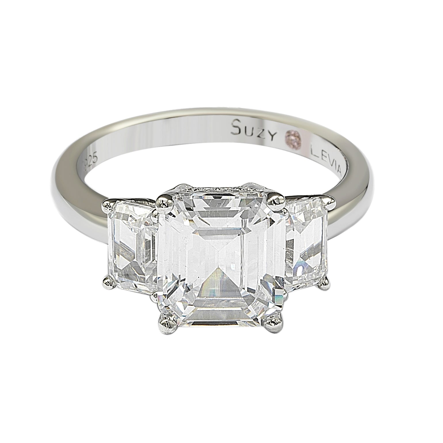 Say yes to the ring! Engage in this beautiful 3-stone bridal ring featuring a 2.50ct white emerald-cut cubic zirconia, centered between 2 smaller 0.50ct emerald-cut cubic zirconias. This ring is crafted of sterling silver and finished with a two-tone plated SL logo in the under gallery. This ring is designed by Suzy Levian with a message. By creating jewelry that is beautiful inside and out, Suzy Levian's message is revealed through a hidden secret signature gemstone set in the shank of this ring to empower women to discover their inner strength, power and beauty. 'Together we can inspire the world to appreciate the diamond in ourselves.' - Suzy Levian