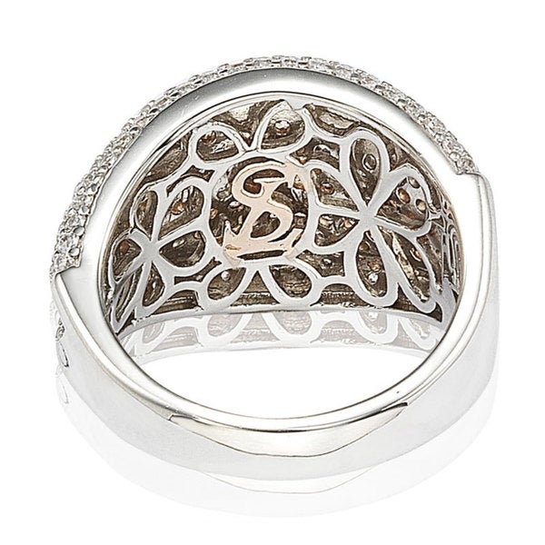 Slip your finger into this popping ring today, featuring over 200round cut white cubic zirconia hand set in sterling silver. This ring is designed by Suzy Levian with a message. By creating jewelry that is beautiful inside and out, Suzy Levian's message is revealed through a hidden stone set inside the shank of this ring to empower women to discover their inner strength, power and beauty. This ring has a closed under-gallery for comfort fit with a two tone plating, highlighting Suzy Levian's SL logo.