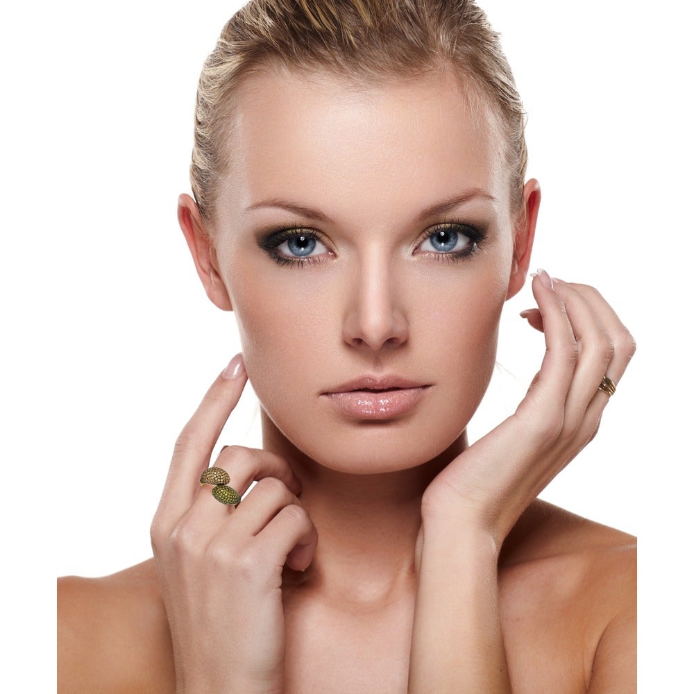 The band of this ring comes together in the center with two bulbous ends, each encrusted in either green or brown cubic zirconia gemstones. Crafted of yellow gold tone sterling silver, this ring has a polished finish and unique design. This ring is designed by Suzy Levian with a message. By creating jewelry that is beautiful inside and out, Suzy Levian's message is revealed through a hidden stone set inside the shank of this ring to empower women to discover their inner strength, power and beauty. This ring has a closed under-gallery for comfort fit with a two tone plating, highlighting Suzy Levian's SL logo.