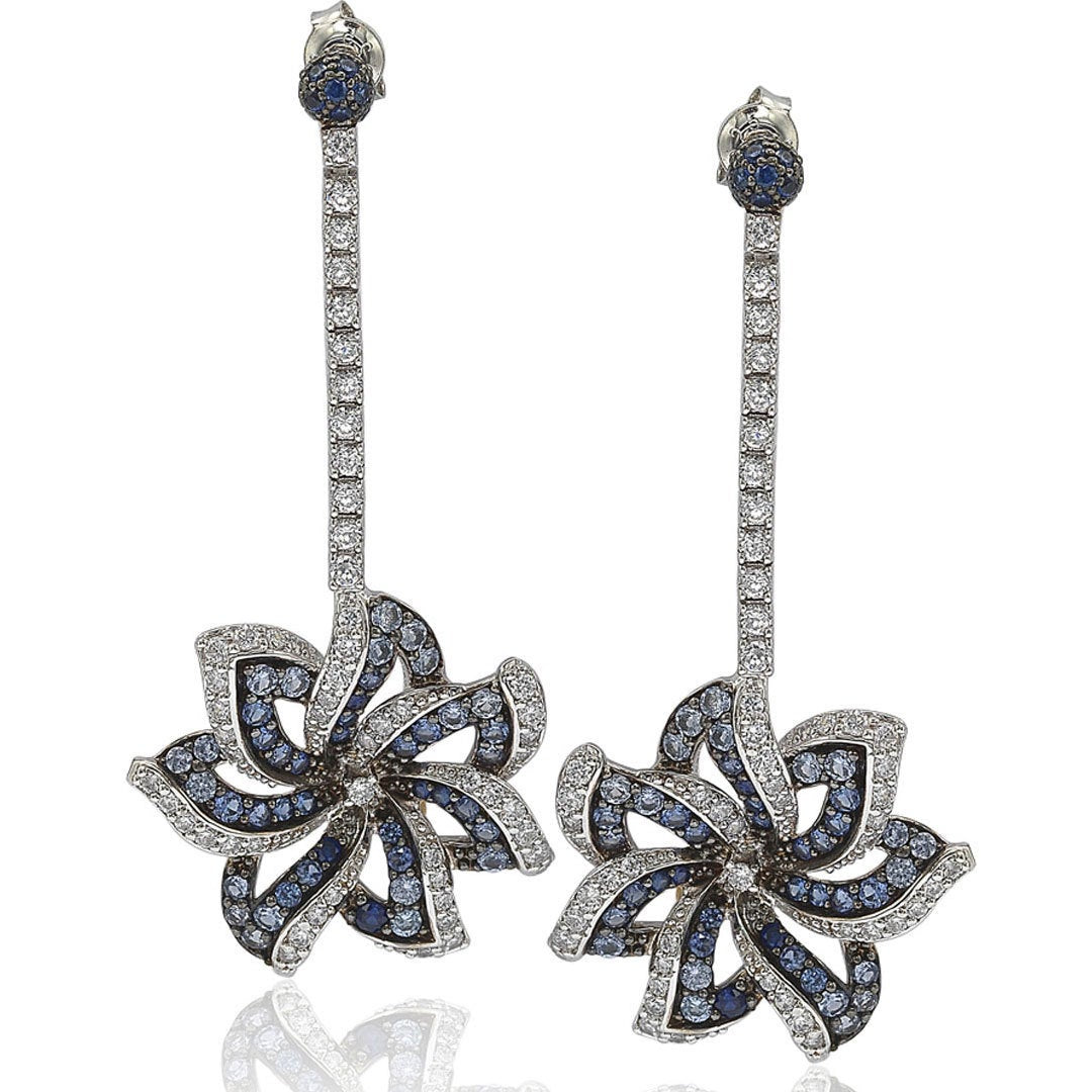 Ornately detailed, these earrings are nothing short of breathtaking. From the Suzy Levian Caribbean blues collection, these gorgeous hang-earrings feature natural blue sapphires (1.87 ct), and created white sapphires (3.0 ct), with natural fancy brown diamonds (.02 ct). Our gems are always hand set in sterling silver, with a unique Suzy Levian gallery and yellow plated logo.