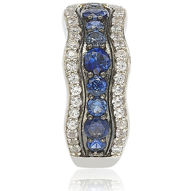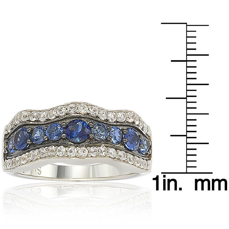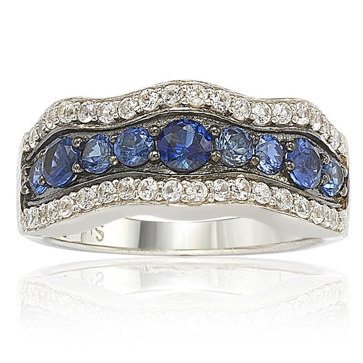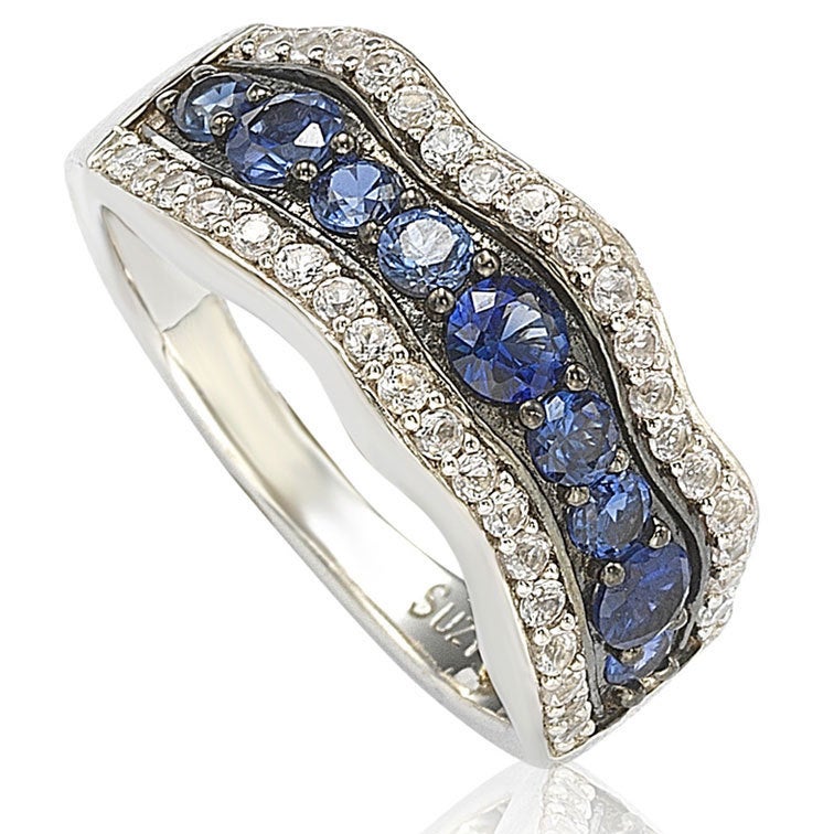 This ring features a sterling silver band with a wavy design and sparkling created white sapphires and blue sapphires in a pave setting.