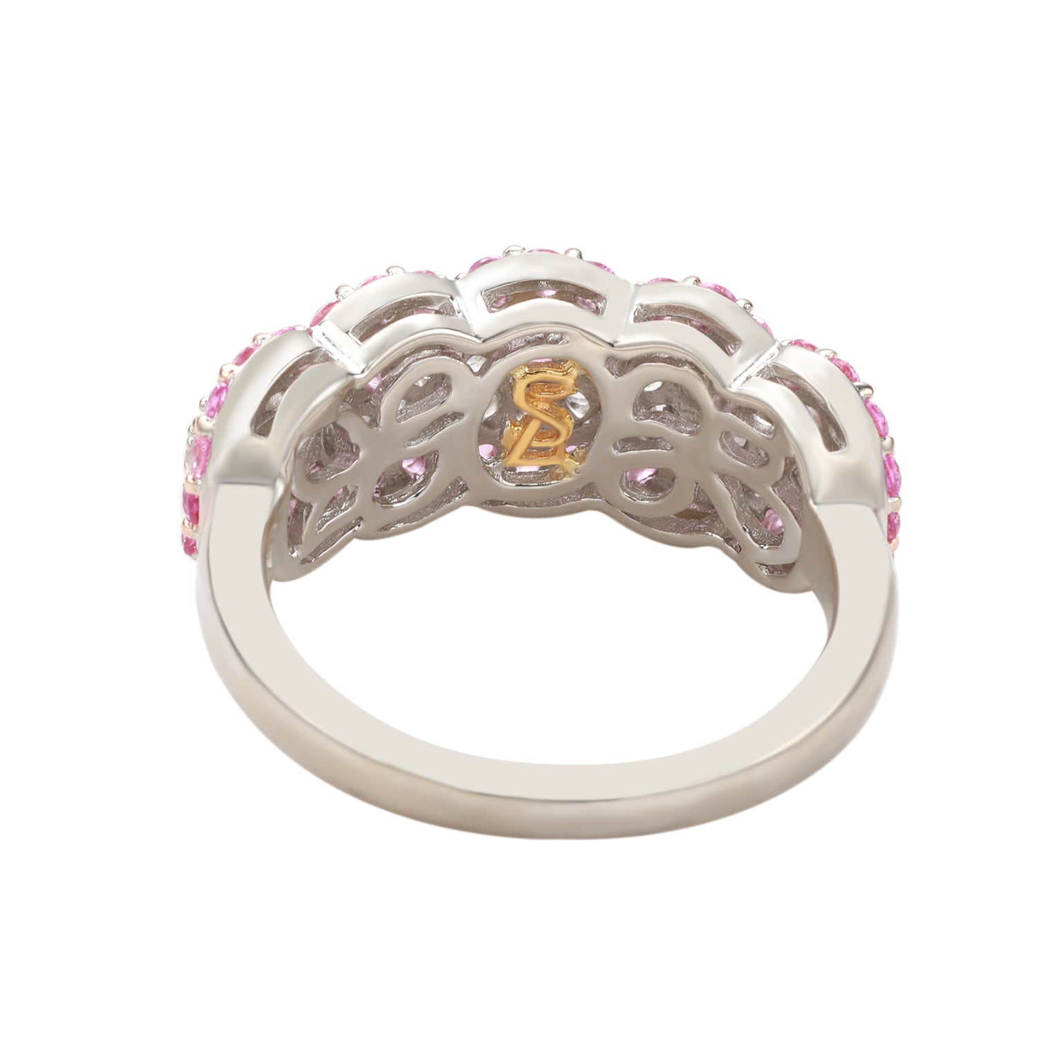 This spectacular anniversary band is crafted from Rose Gold Plated sterling silver and features an eye-catching multi-circle design. The ring is pave set with 1.03 carats of natural pink sapphires, 1.04 carats of created white sapphires, and a .02 carat fancy brown diamond. This Suzy Levian gallery ring features her unique logo on the inside of the band.