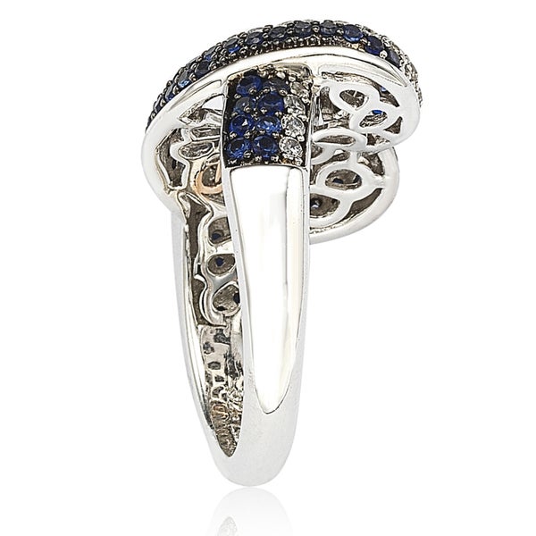 A dreamy ring that sparkles with intense color featuring natural blue sapphires (1.33 ct) and created white sapphires (1.15 ct) with a natural fancy brown diamond (.02 ct). Hand set in sterling silver, with a unique designer Suzy Levian gallery and 18K gold logo.
