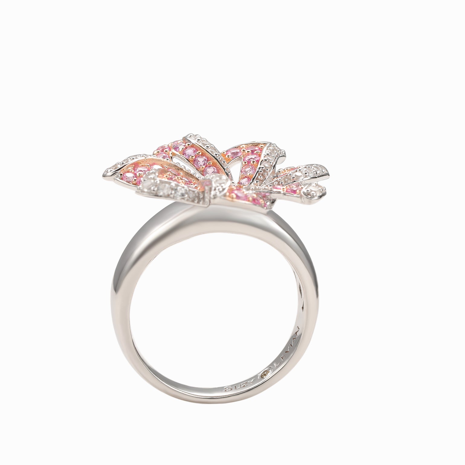 A dreamy ring that sparkles with intense color, featuring natural pink sapphires (0.75 ct) and created white sapphires (0.97 ct) with a natural fancy brown diamond (.02 ct). Hand set in sterling silver, with a unique designer Suzy Levian gallery and golden SL logo.