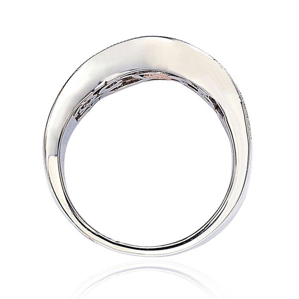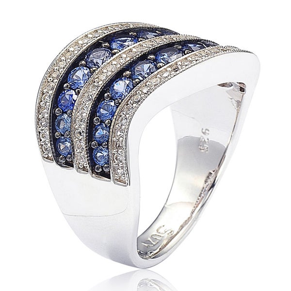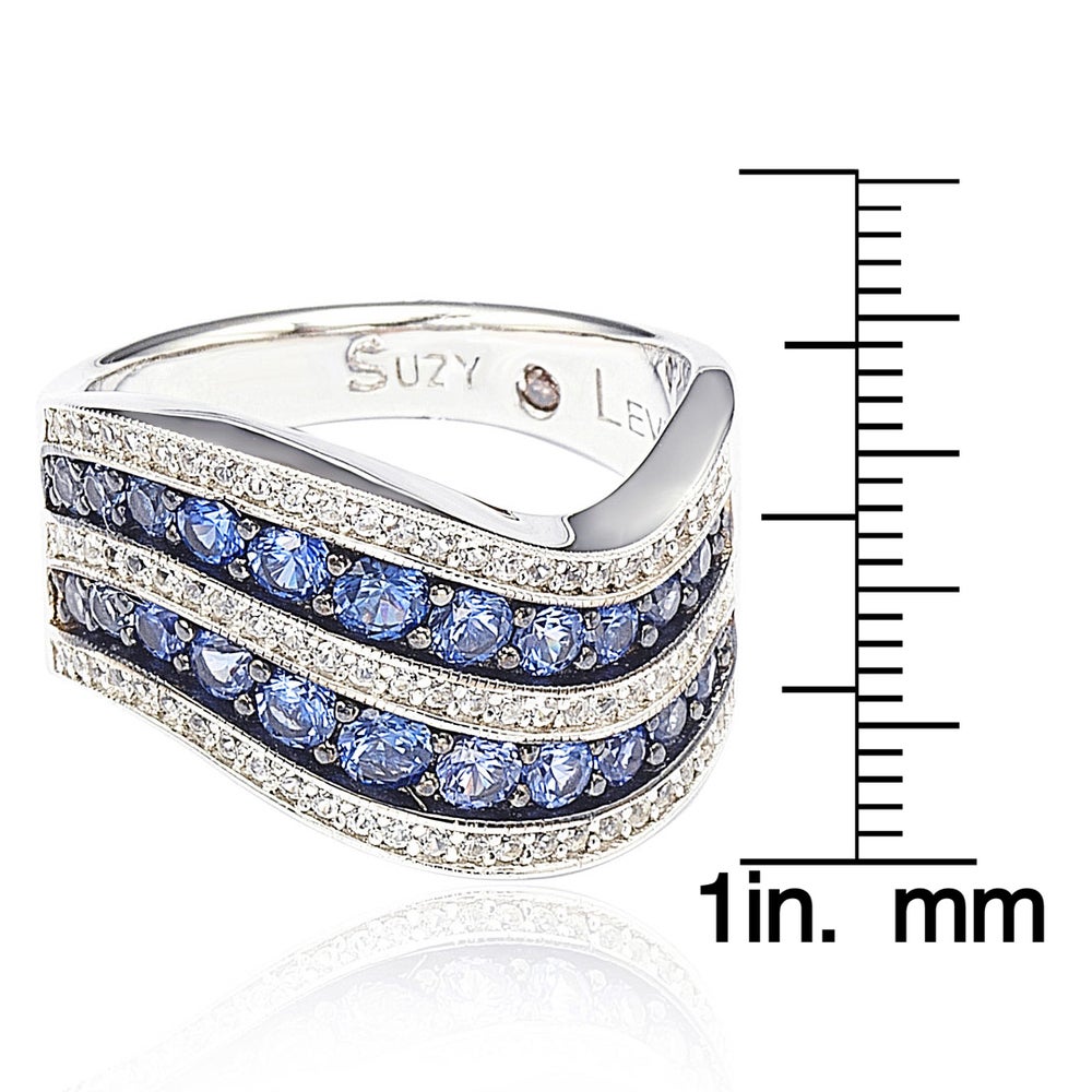 23 gorgeous blue sapphires are prong-set along 2 rows across the wavy sterling silver band. Highlighted by 3 wavy rows of 72 smaller created white sapphires, the band creates a wavy, chic design. Each precious gemstone features a perfect round cut that makes it shine brightly. The high-finish polish on the sterling silver gives an extra brightness to make sure your ring really sparkles your look! This ring has a closed under-gallery for comfort fit with a two tone 18k gold plating, highlighting Suzy Levian's Suzy Levian logo.This ring is designed by Suzy Levian with a message. By creating jewelry that is beautiful inside and out, Suzy Levian's message is revealed through a hidden secret brown diamond (.02 ct) set in the shank of this ring to empower women to discover their inner strength, power and beauty.