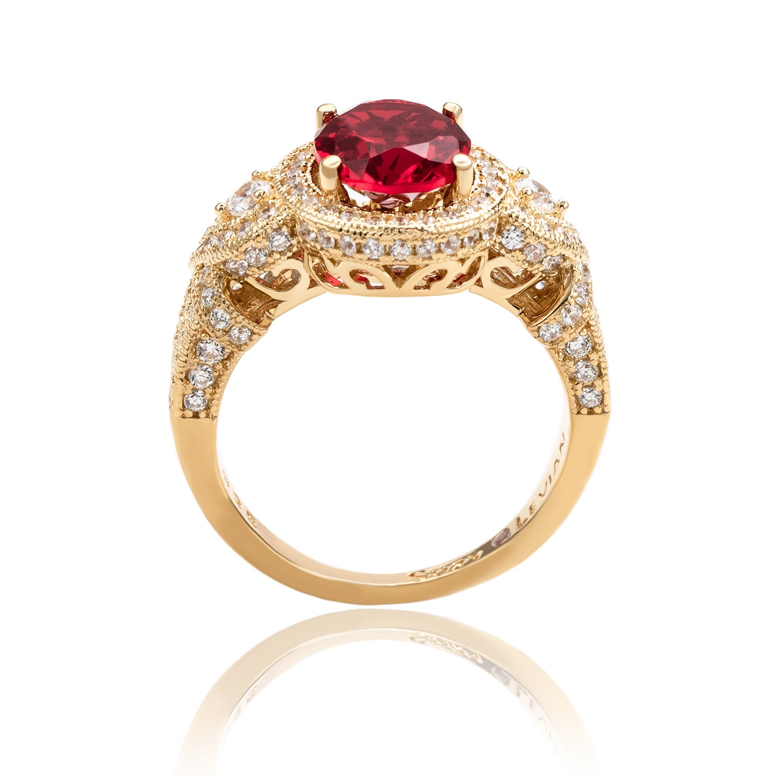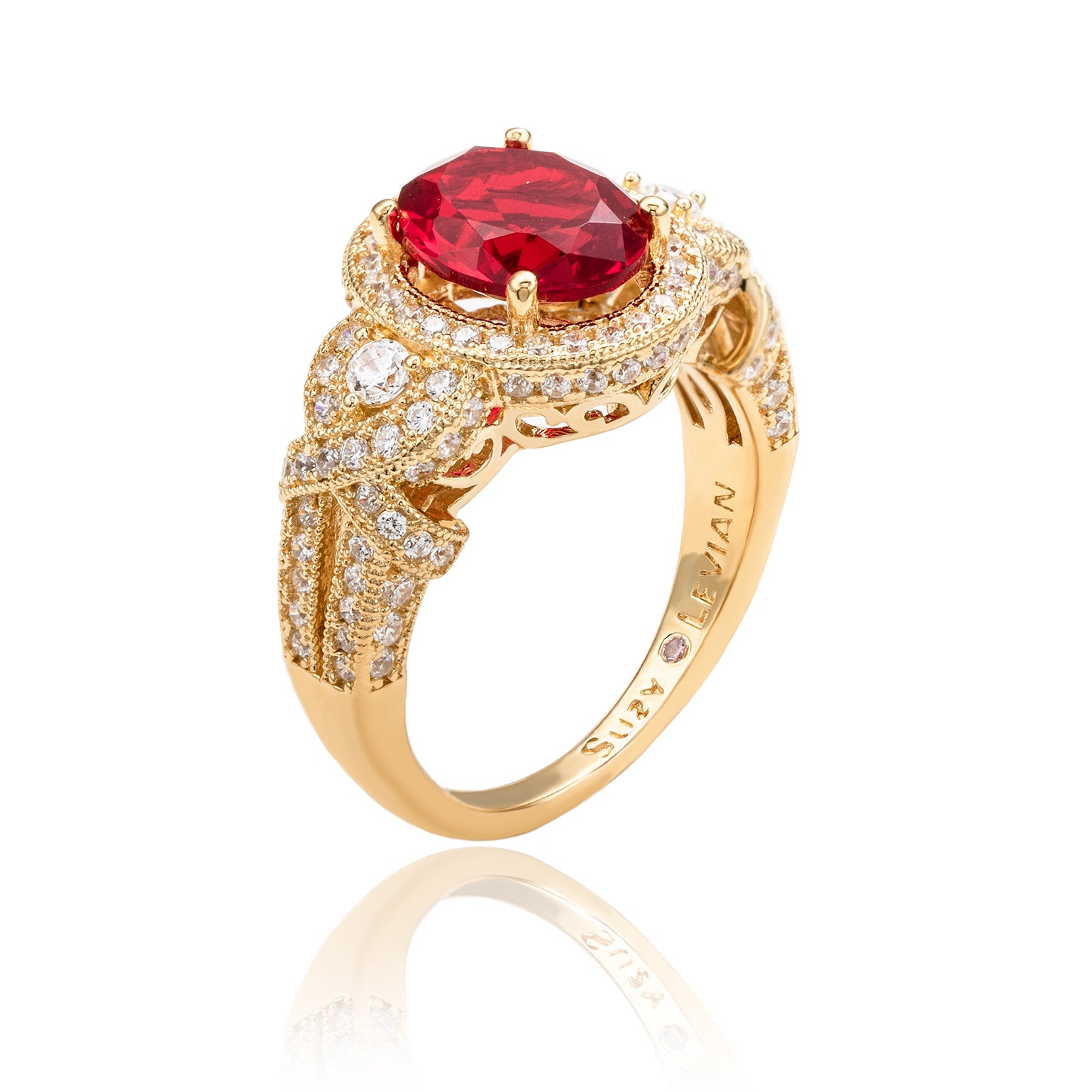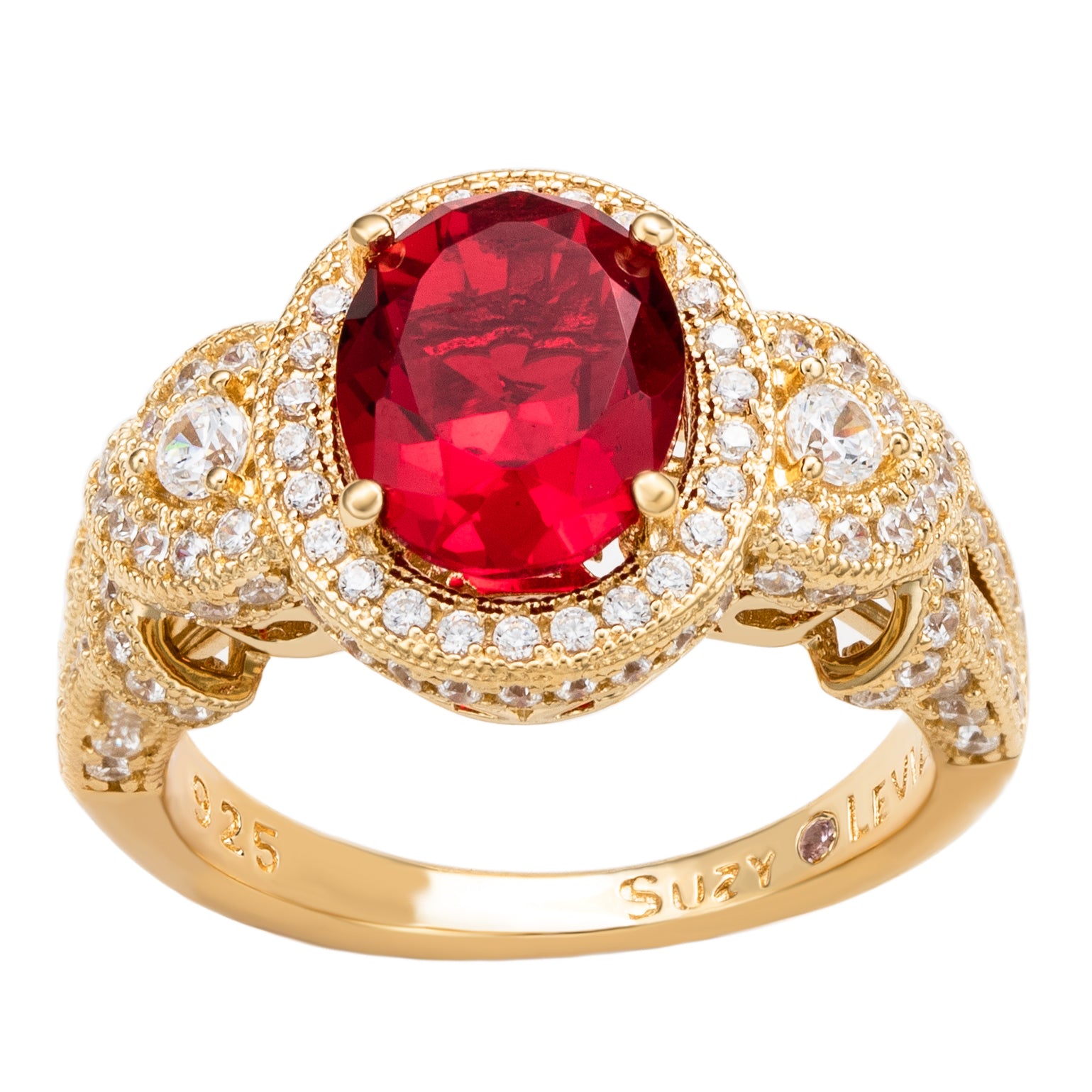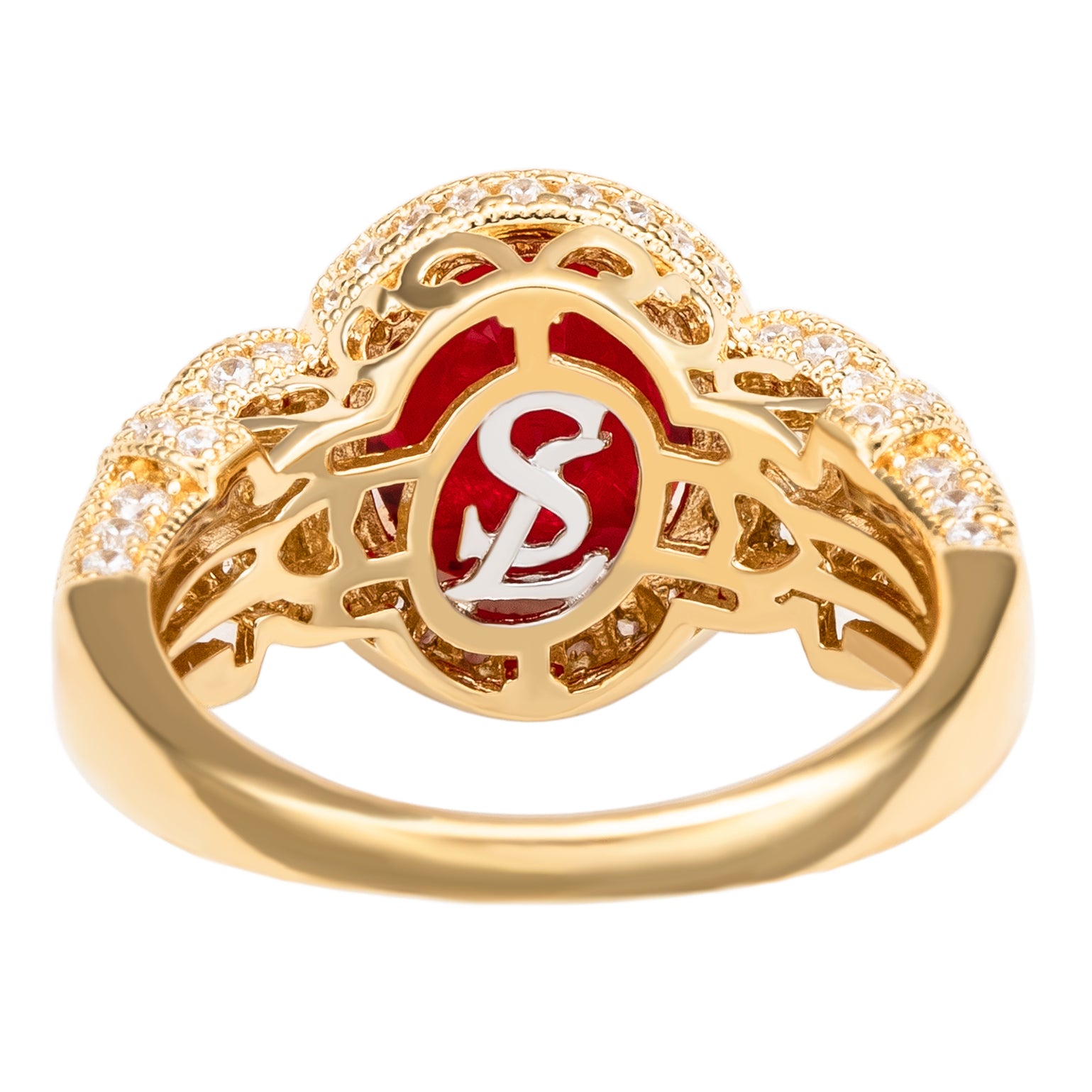 This sophisticated ring features a large oval-cut red cubic zirconia center stone with a white cubic zirconia pave halo, and side stones. Going down the band of this ring there are white cubic zirconia's, hand-set in yellow plated sterling silver. This ring is designed by Suzy Levian with a message. By creating jewelry that is beautiful inside and out, Suzy Levian 's message is revealed through a hidden stone set in the shank of this ring to empower women to discover their inner strength, power and beauty. This ring has a closed under-gallery with a two tone plating, highlighting Suzy Levian 's SL logo. This glamorous ring is perfect for any special occasion, or a girls night out.