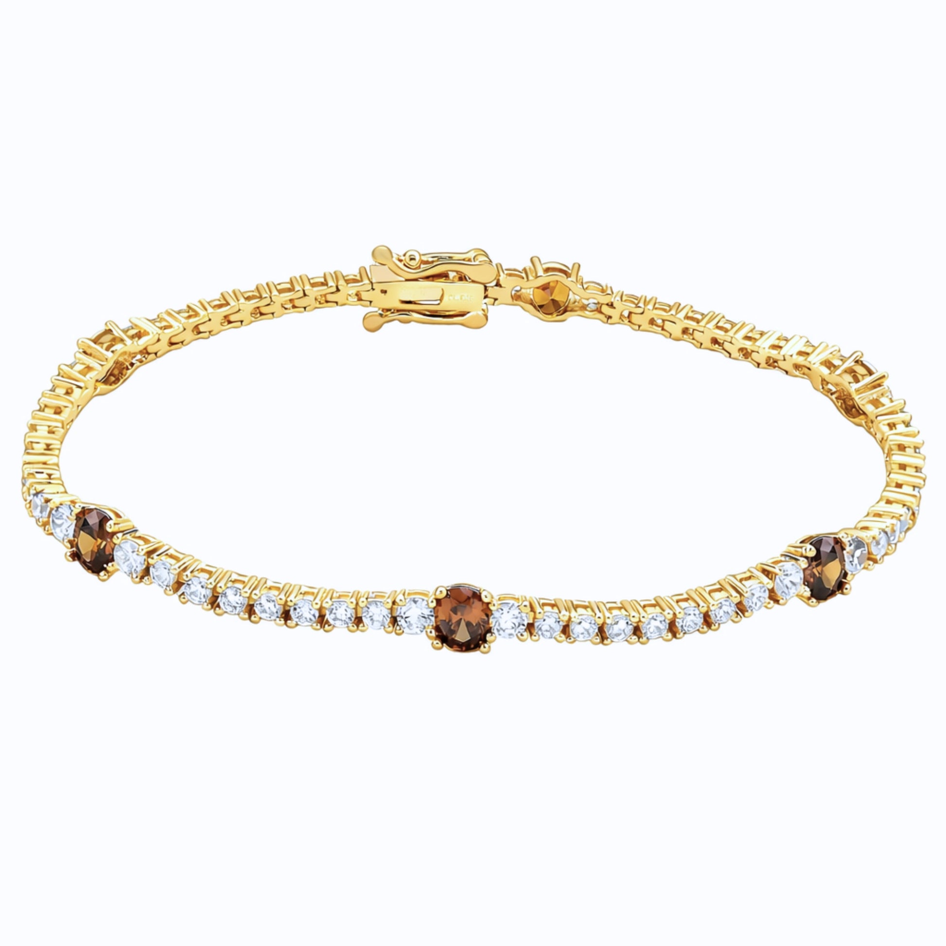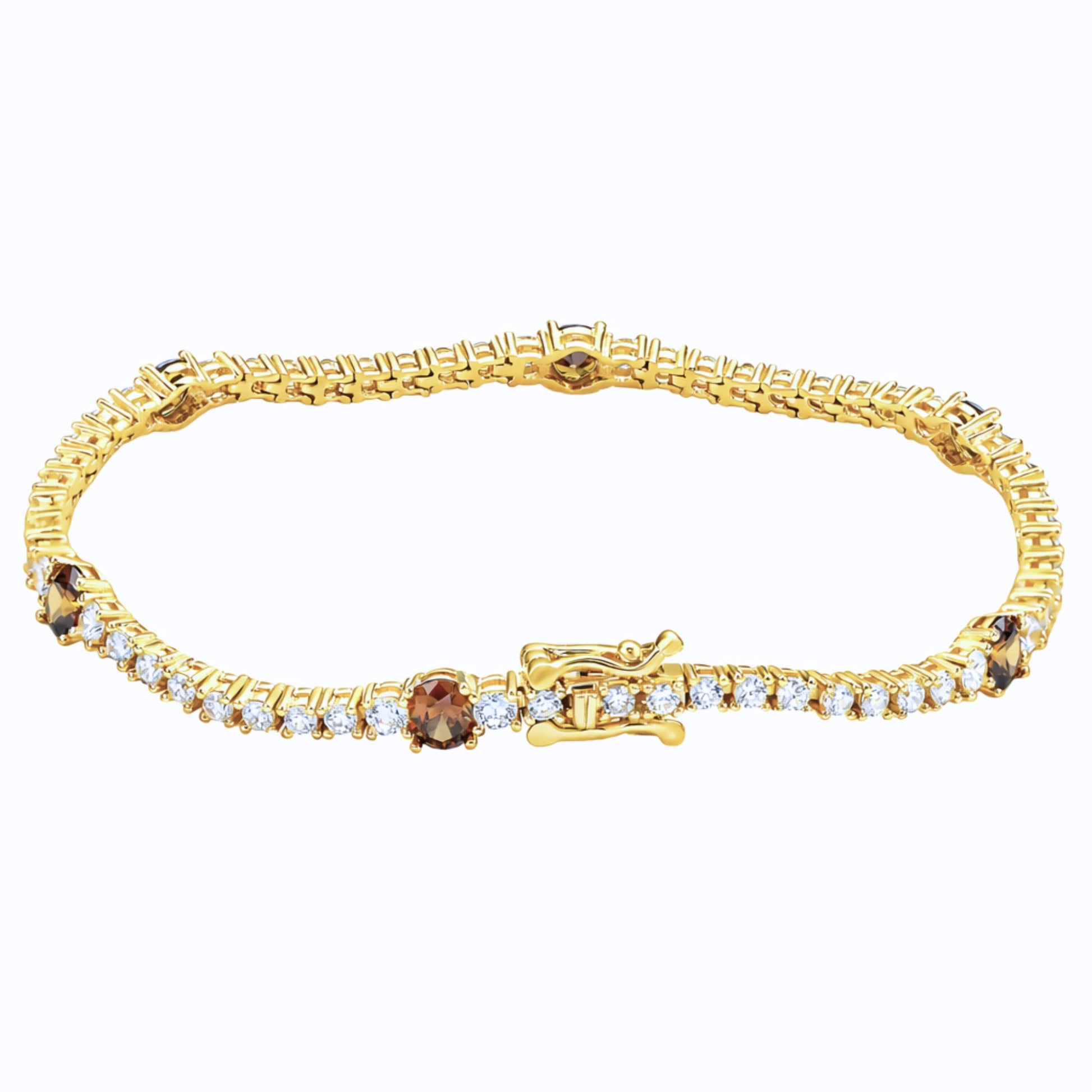 A tasty pattern of 5 mm, prong-set brown cubic zirconia are evenly distributed through a line of small pave-set white cubic-zirconia creating a delicious. This Suzy Levian rich bracelet that will be the perfect match to your wardrobe. Perfectly stackable with any Suzy Levian bracelet. Please note that each Suzy Levian creation is handcrafted. All Suzy Levian jewelry are made of 925 yellow sterling silver, high quality and carefully selected cubic zirconia, providing our customers with the finest accessories. A double side lock ensures for an easy, safe and secure fit the whole time it's locked on your wrist.
