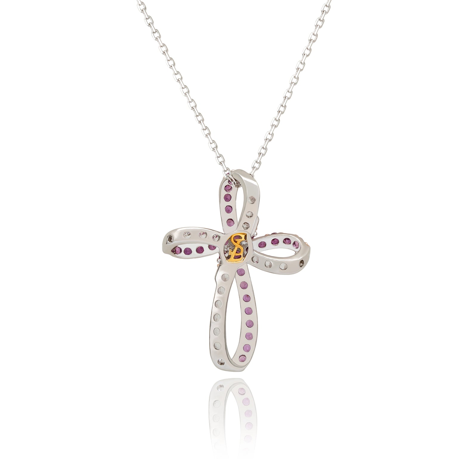 Express your faith with exquisite elegance when you wear this Suzy Levian pink sapphire and rose and white sterling silver cross necklace. Rich natural pink sapphires are shadowed by shiny created white sapphires in a luxurious yet whimsical pave setting for an empowered cross that can be worn everyday or just for dressing up. This beautiful cross pendant is hung on a 18" cable chain and is secured with a spring ring clasp. It's subtle design flaunts your simple yet sophisticated style. This pendant is designed by Suzy Levian with a message. By creating jewelry that is beautiful inside and out, Suzy Levian's message is revealed through a hidden brown diamond set in the shank of this pendant to empower women to discover their inner strength, power and beauty. This pendant has a closed under-gallery, highlighting Suzy Levian's 18k solid yellow gold SL logo. 'Together we can inspire the world to appreciate the diamond in ourselves.' - Suzy Levian