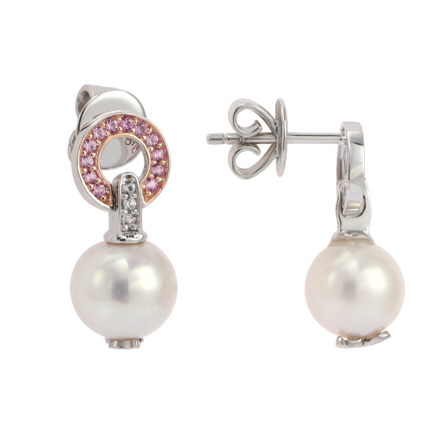 From Suzy Levian's Shangri-La Pearls collection, these earrings feature timeless beauty in a breathtaking design. A circle of pave set natural pink sapphires and created white sapphires connect to an 8mm white cultured freshwater pearl to create a double circle effect with the sapphires and pearls. The natural pink sapphire gemstones are set in rose gold plated sterling silver with a high polish finish for extra shine. These are the perfect earrings for all women. These earrings were created with a message. By creating jewelry that is beautiful inside and out, Suzy Levian sets an Suzy Levian logo at the bottom of every earring to inspire women to let their beauty shine from bottom to top, from the inside out.