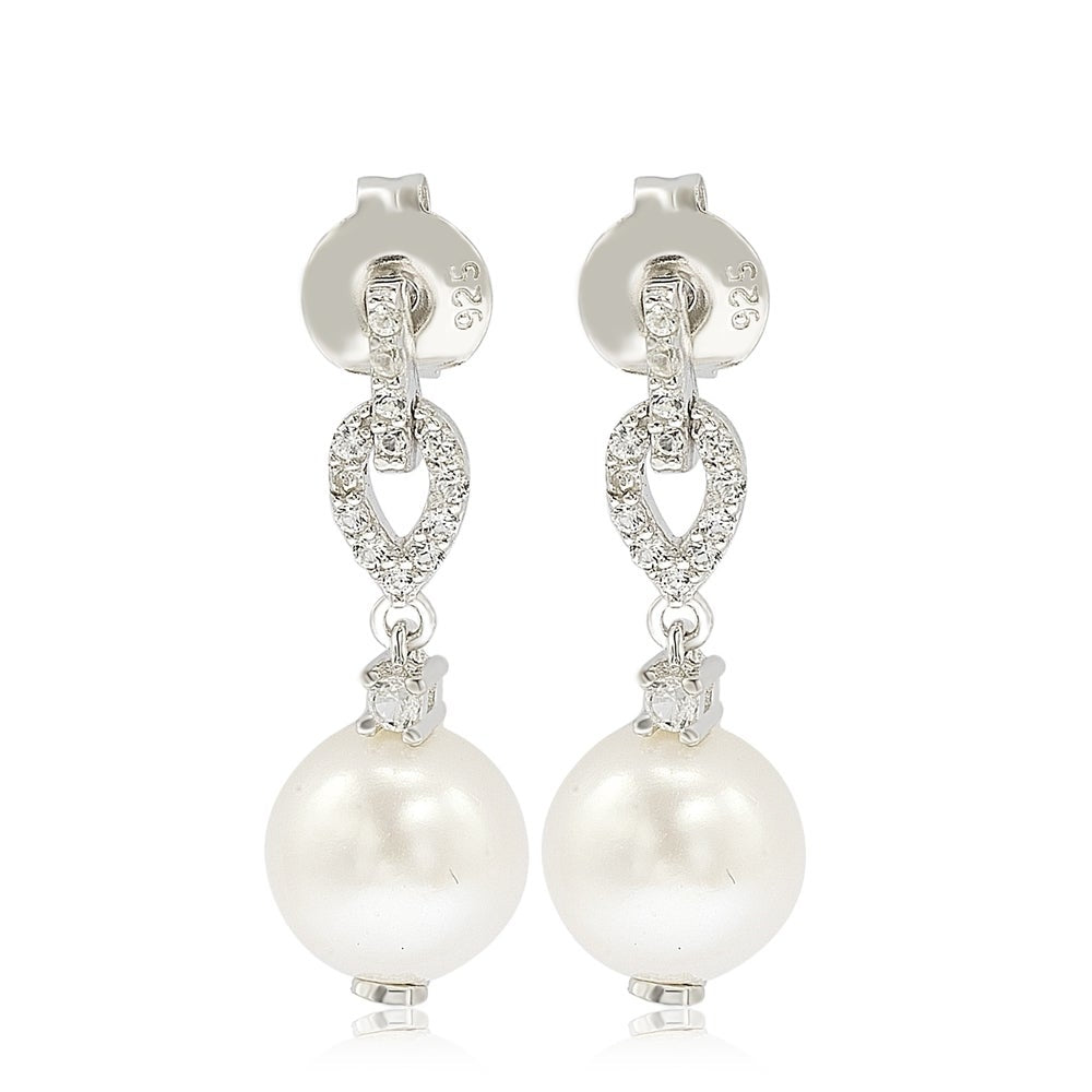 Timeless beauty in a breathtaking design, these earrings feature an 8mm white cultured freshwater pearl dangling from a gorgeous array of pave-set created white sapphires, hand-set in sterling silver. A pear-shaped pattarn allows for a loose look, giving extra mobility for your earrings to sway with the music as you dance the night away. All the gemstones are set in sterling silver with a high polish finish for extra shine. These are the perfect earrings for all women. These earrings were created with a message. By creating jewelry that is beautiful inside and out, Suzy Levian sets an Suzy Levian logo at the bottom of every earring to inspire women to let their beauty shine from bottom to top, from the inside out.
