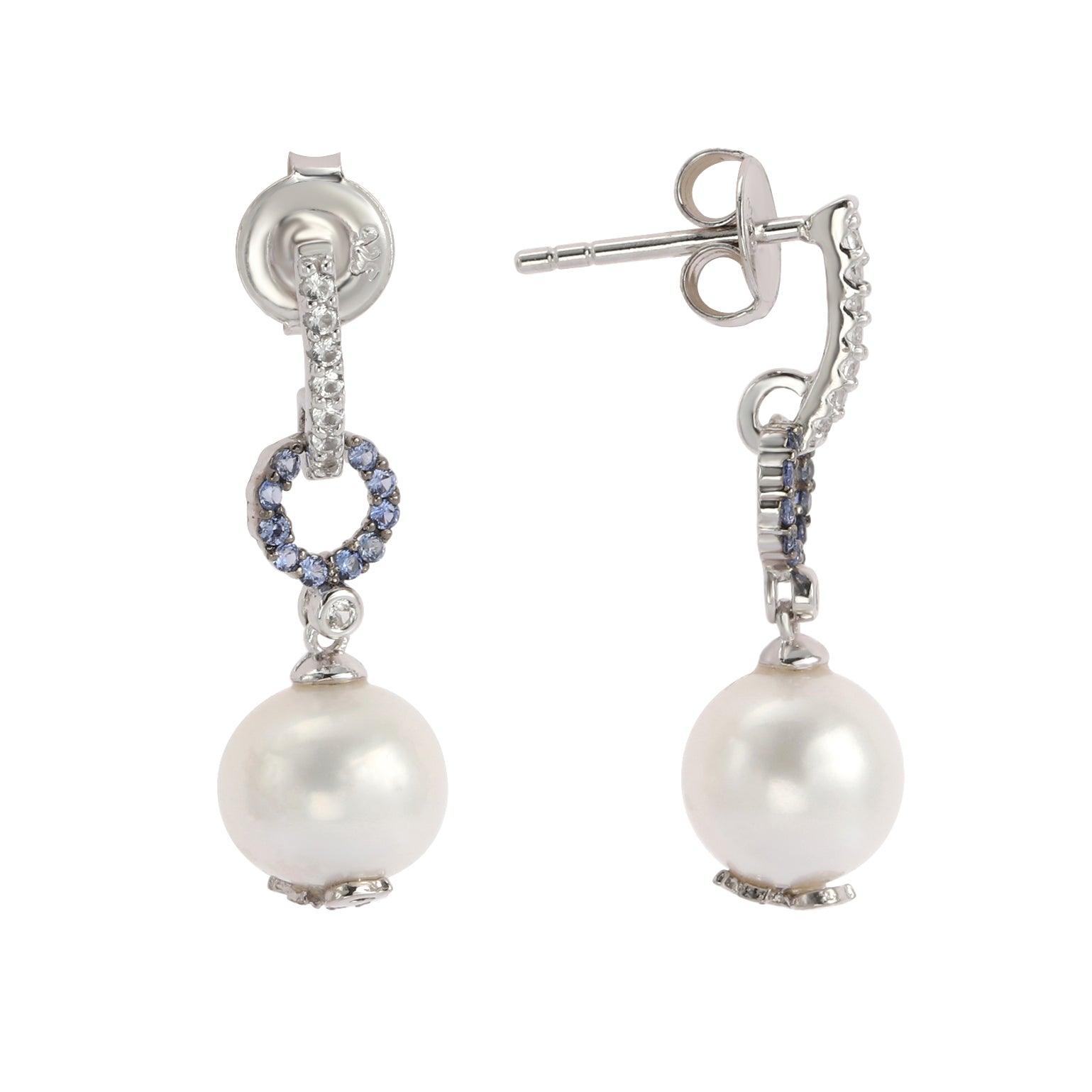 Suzy Levian Sterling Silver Pearl & Blue Sapphire Dangle Earrings