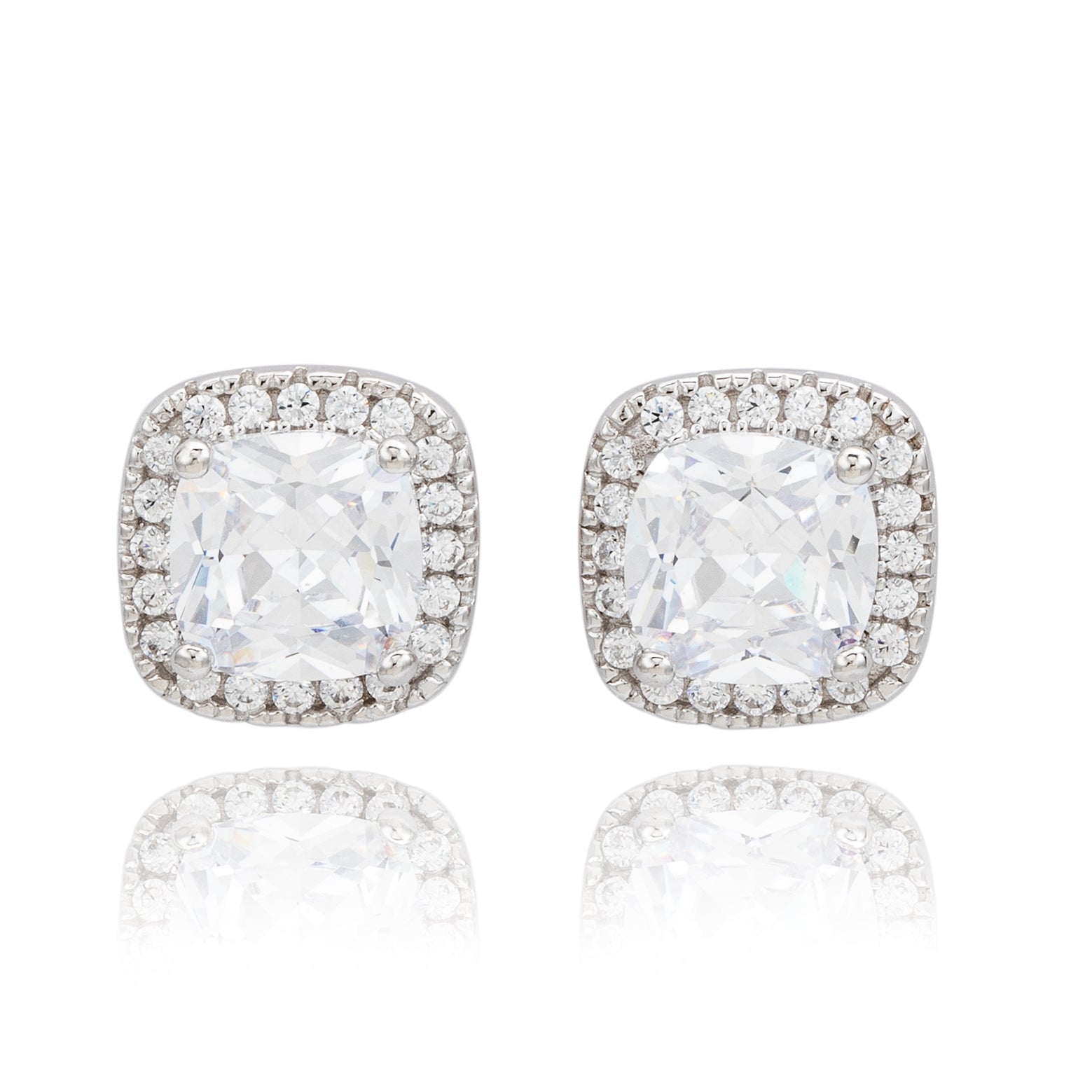 Suzy Levian White Sterling Silver Cushion Cut White Cubic Zirconia Halo Studs
