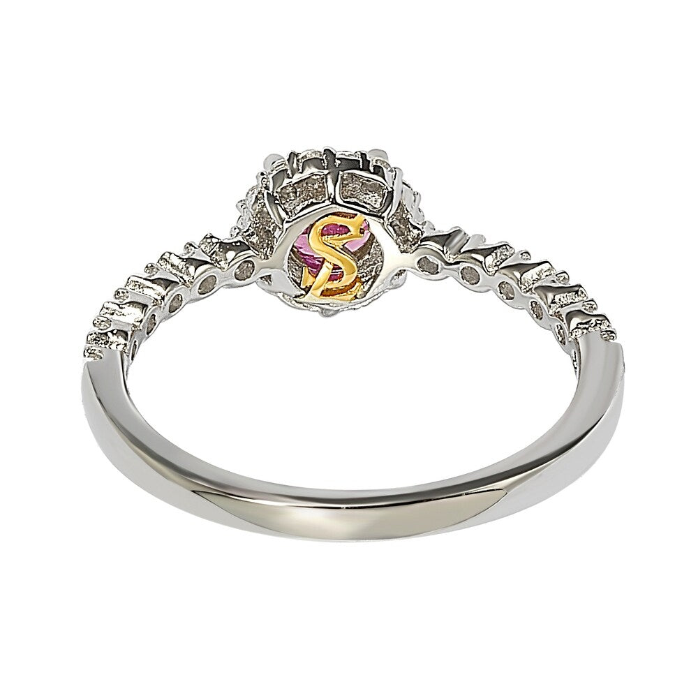 Enjoy this beautiful petite bridal ring featuring a round cut pink sapphire center stone (0.40ct), surrounded by a created white sapphire pave-set halo continuing down the band of the ring. This beautiful ring is from Suzy Levian's latest collection, "Petite Perfects", designed for ladies who prefer a more slimmed, less bulky look, whether it's an extra acceserry in the workplace or an addition pop of color to your night-time ensemble! This ring is designed by Suzy Levian with a message. By creating jewelry that is beautiful inside and out, Suzy Levian's message is revealed through a hidden secret signature diamond (.02ct) set in the shank of this ring to empower women to discover their inner strength, power and beauty. This ring has a closed undergallery with an 18k yellow gold SL logo to highlight Suzy L.'s signature stamp. 'Together we can inspire the world to appreciate the diamond in ourselves.' - S.L.