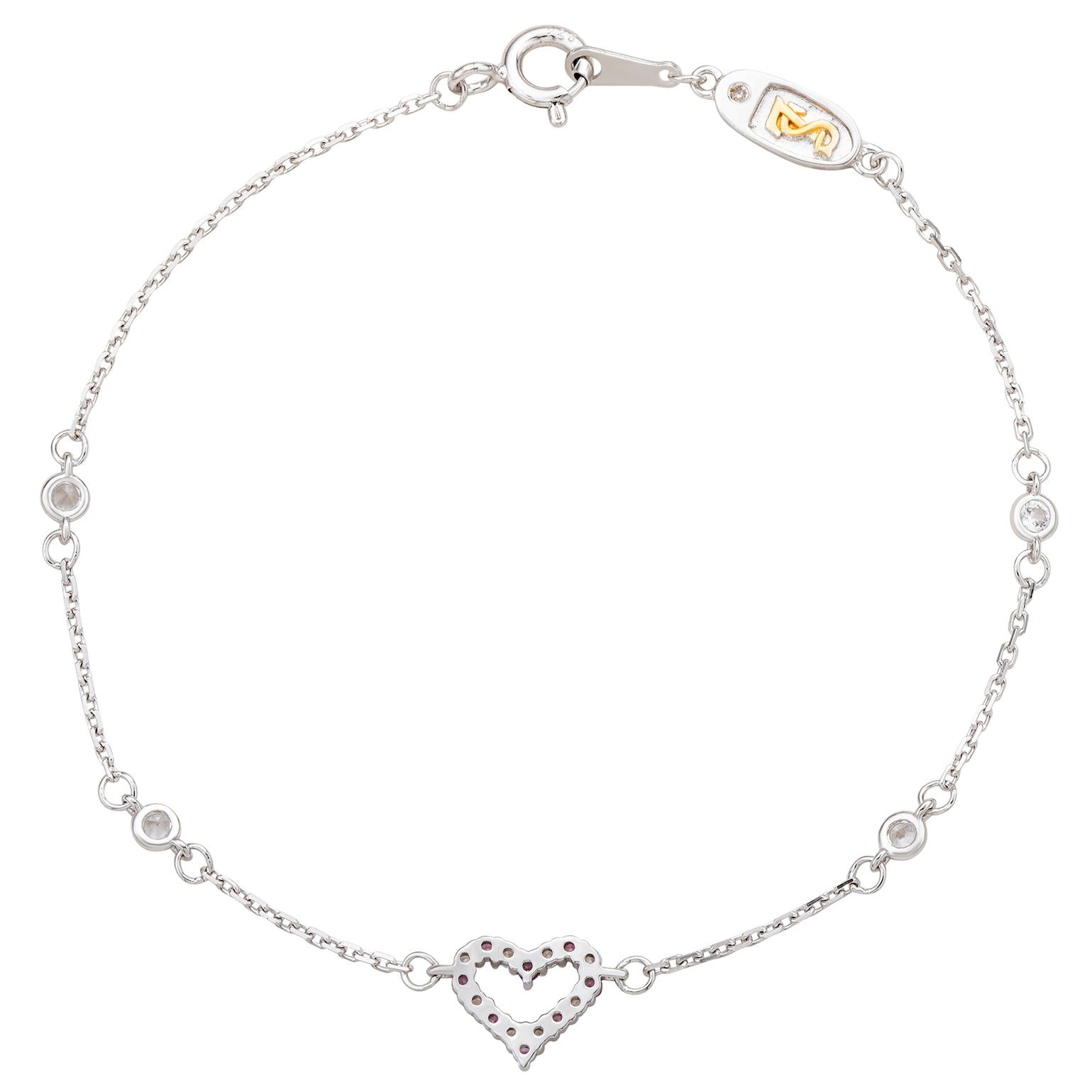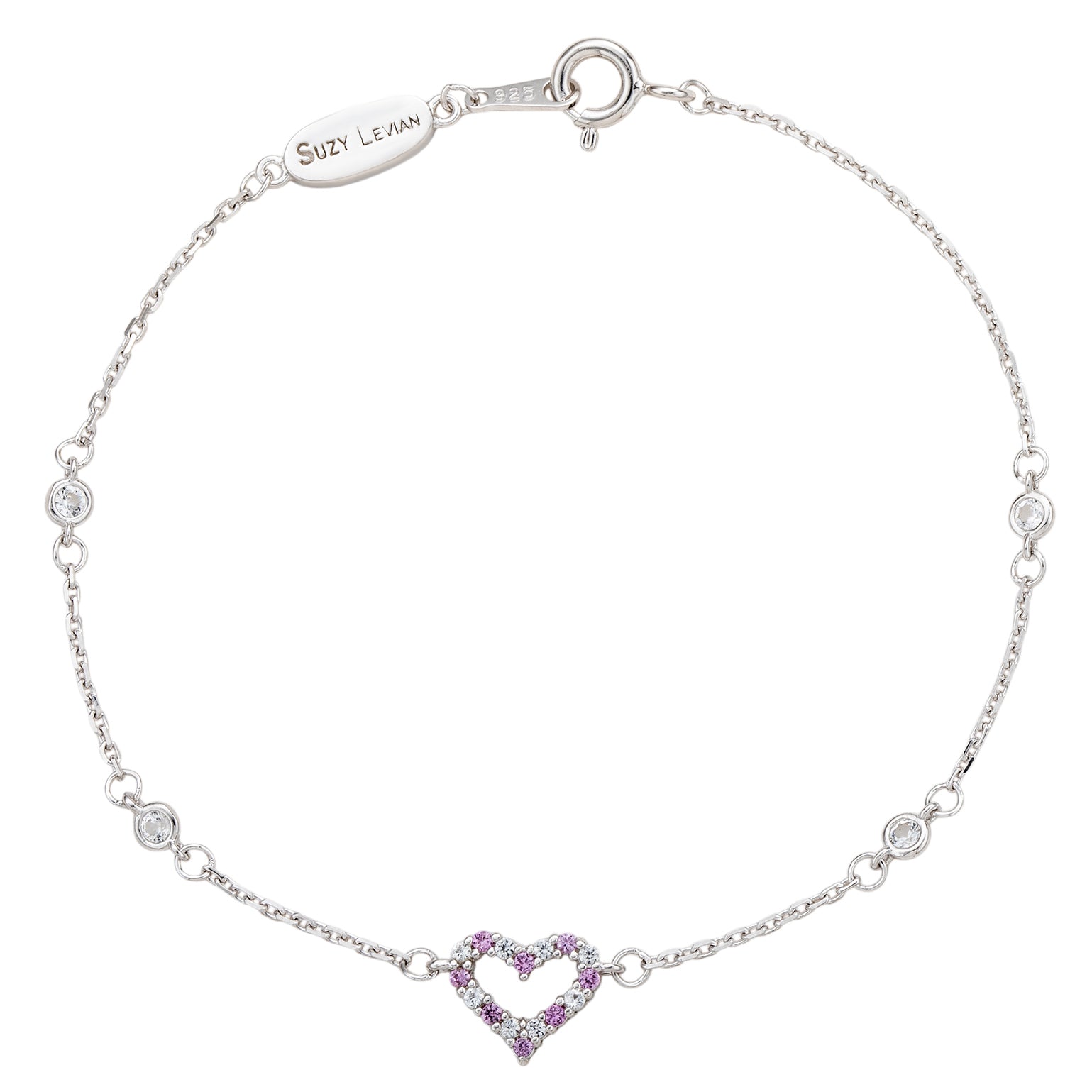 This elegant bracelet features alternating round-cut pink sapphires and created white sapphires set in a delicate heart centered between four bezel-set created white sapphires, stationed across a sterling silver bracelet. This bracelet has a spring ring closure with a unique plaque embracing Suzy Levian's yellow plating SL logo and Signature Secret Brown Diamond. By creating jewelry that is beautiful inside and out, Suzy Levian's message is revealed through a hidden diamond set inside this plaque, meant to empower women to discover their inner strength, power and beauty that is hidden within themselves. A high polish finish completes the look. This is the perfect bracelet to wear on its own or stacked with other bracelets. This makes a great gift to give for a special loved one on any occasion, such as graduation, birthdays, holiday gift, bat- mitzvahs, and anniversaries!