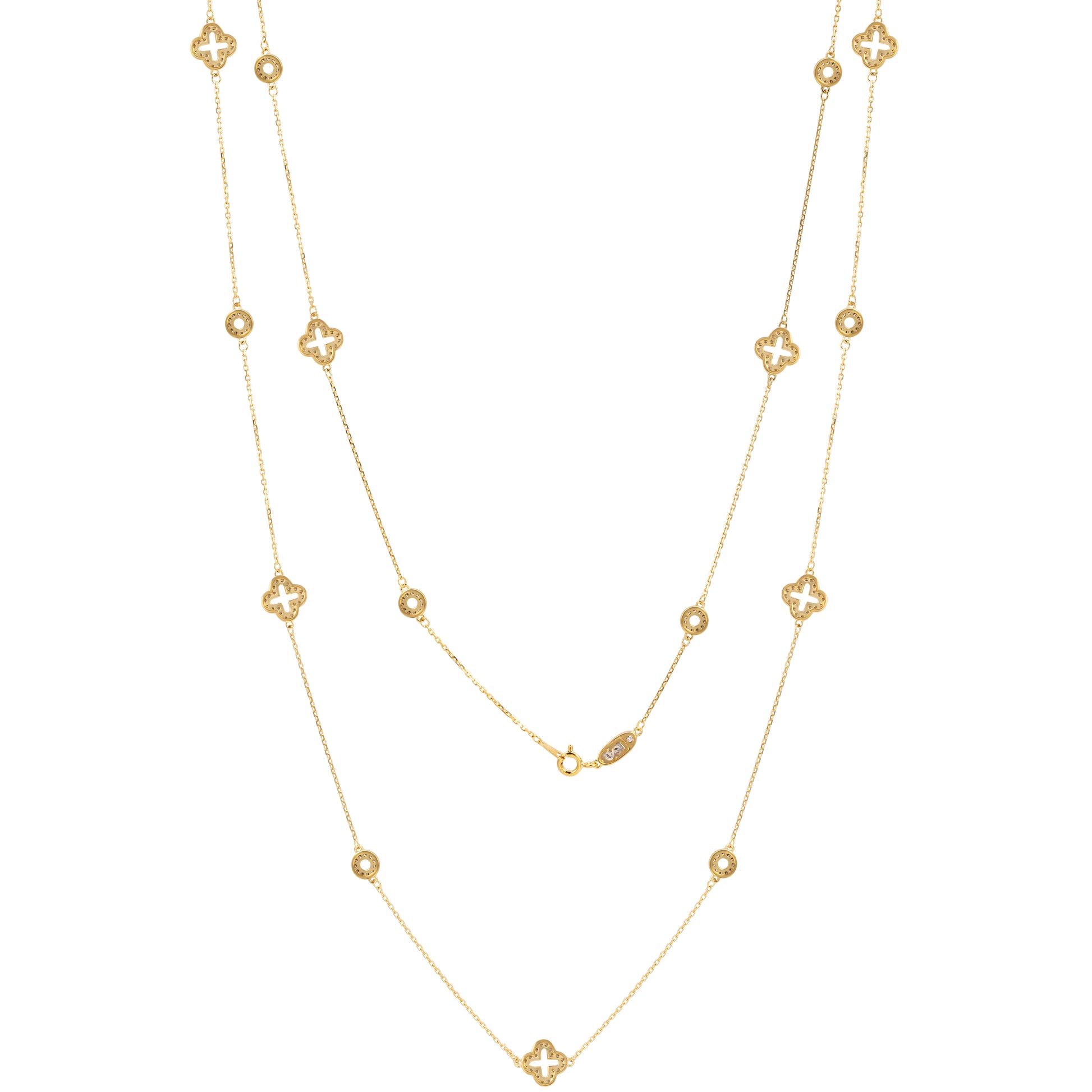 With elegance and subtlety, this Suzy Levian Botanical Gardens creation has become an icon of class, luxury and style. This 36 inch station necklace contains and alternates clover and circle whimsical motifs, and whispers the message that happiness renews itself everyday. Each Suzy Levian creation is handcrafted and made of 925 yellow sterling silver, high quality and carefully selected cubic zirconia, providing our customers with the finest accessories. This necklace locks with a spring ring closure to ensure a safe and secure fit the whole time it's on your neck. This necklace contains seven clovers and eight circle motifs. There is a plaque next to clasp with a signature rose gold plated SL logo and a Signature Secret Stone.