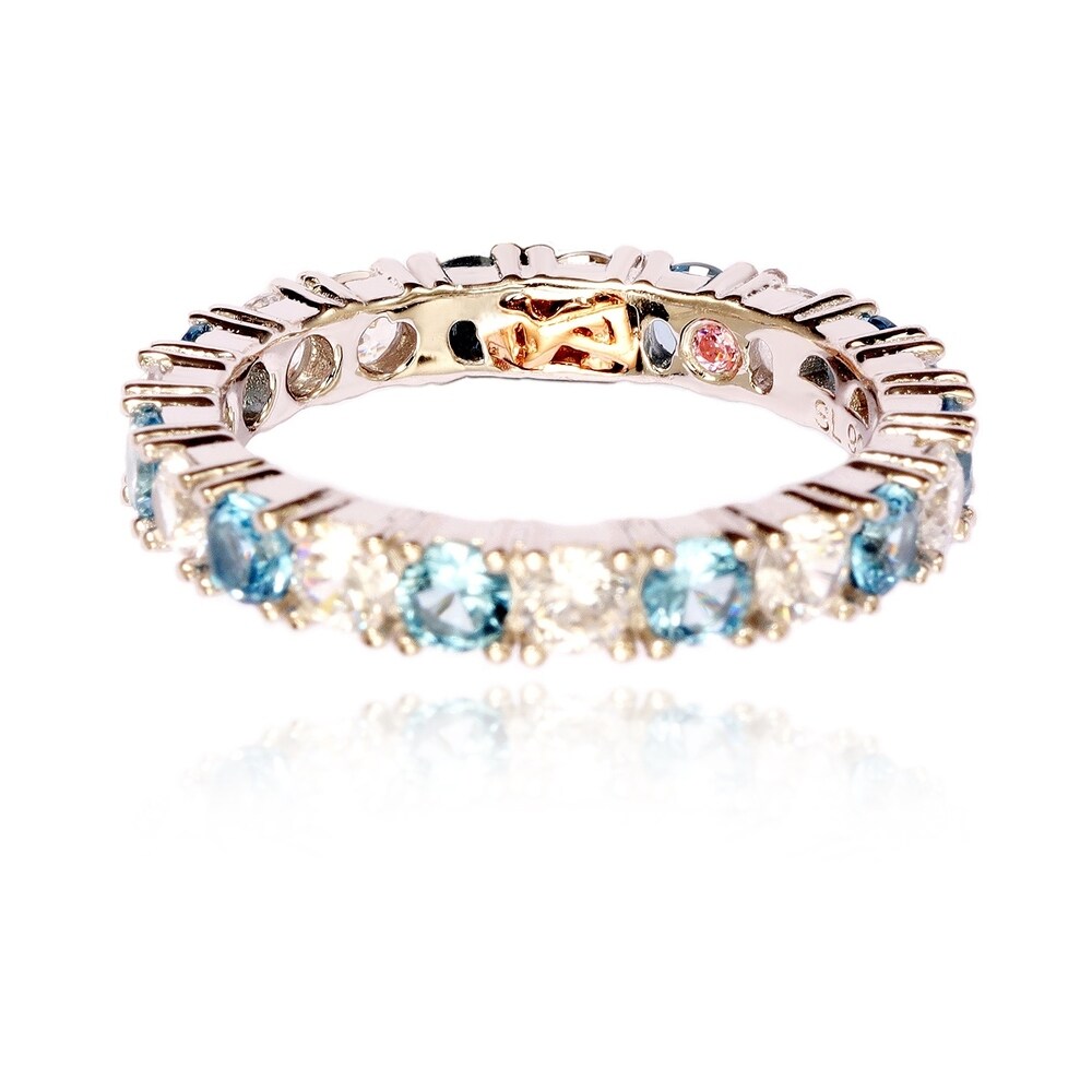 Radiant round-cut aqua blue and sparkling white cubic zirconias are set along the entire band of this wedding band ring, lending dazzle to your reminder of commitment. Designed by Suzy Levian, this 925 sterling silver eternity ring features a high polish finish. Beautiful on it's own or perfectly stackable with another Suzy Levian design, this flawless, elegant design comes with endless fashion possibilities. It's the perfect gift for any occasion. This ring is eye-catching on its own or can also be worn with your engagement ring. Remind yourself of your love and commitment every time you look at this elegant ring. This ring packs an impressive amount of elegance into its sturdy prong settings. The low profile keeps your gems safe and prevents snagging on fabrics. This ring is designed by Suzy Levian with a message. By creating jewelry that is beautiful inside and out, Suzy Levian's message is revealed through a hidden gemstone set in the shank of this ring to empower women to discover their inner strength, power and beauty. 'Together we can inspire the world to appreciate the diamond in ourselves.' - Suzy Levian