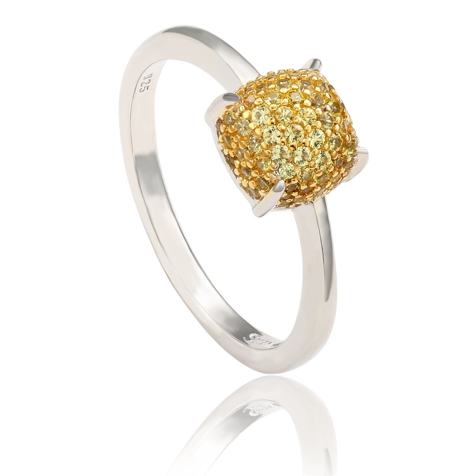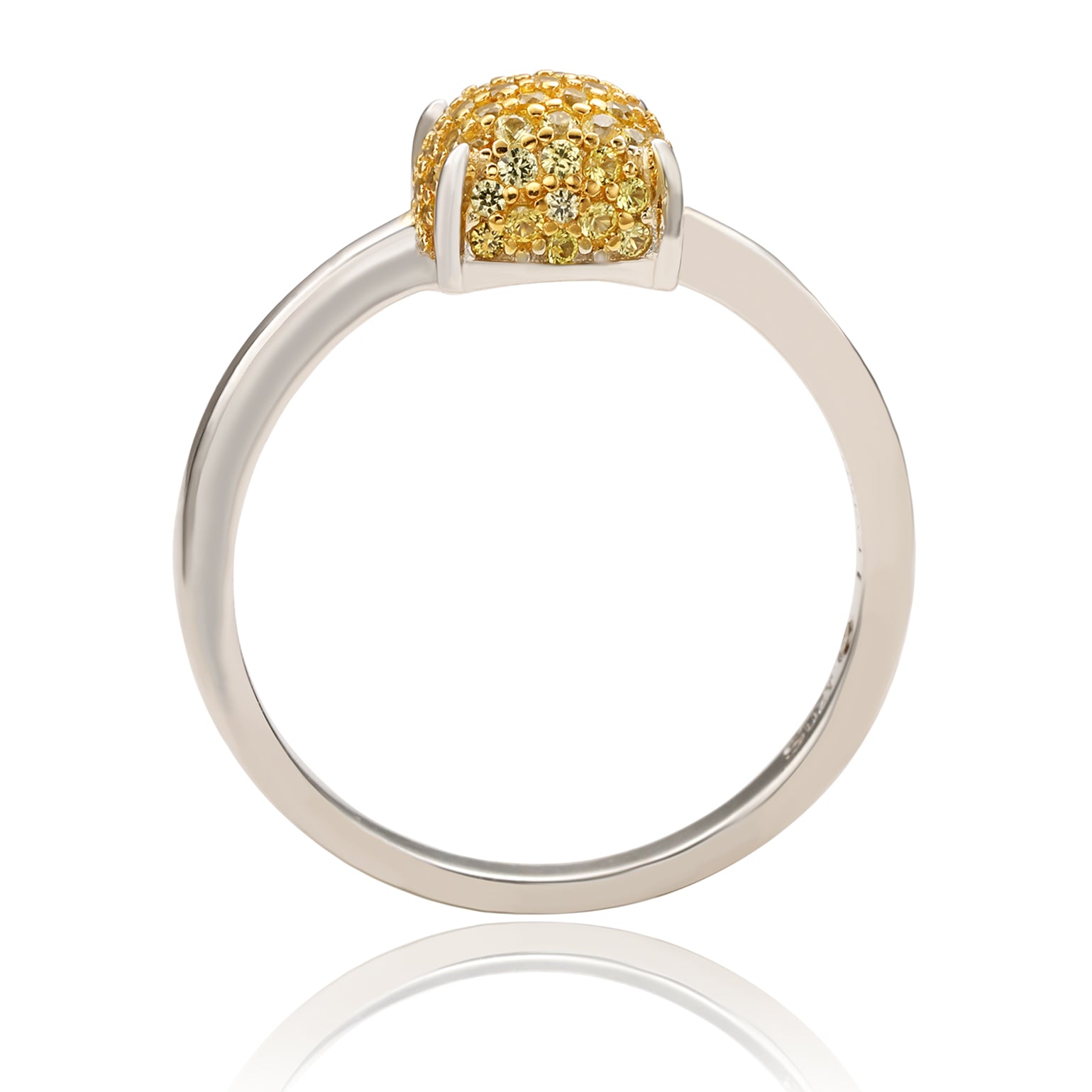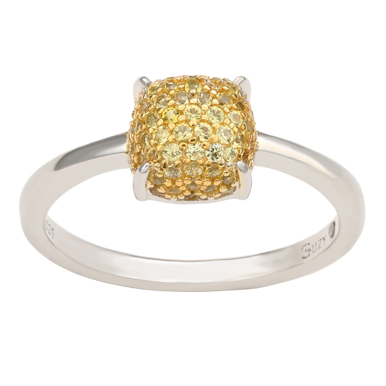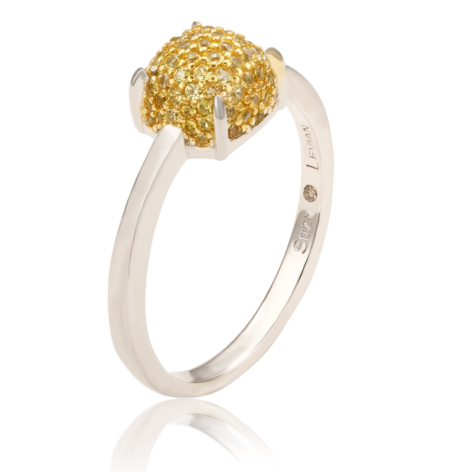 Enjoy these beautiful yellow sapphire hues. A cluster of pave natural yellow sapphires create a ball-top design, set in a sterling silver band. This beautiful ring is from Suzy Levian's latest collection, "Petite Perfects", designed for ladies who prefer a more slimmed, less bulky look, whether it's an extra accessory in the workplace or an addition pop of color to your night-time ensemble! This ring is designed by Suzy Levian with a message. By creating jewelry that is beautiful inside and out, Suzy Levian's message is revealed through a hidden secret signature diamond (.02ct) set in the shank of this ring to empower women to discover their inner strength, power and beauty. This ring has a closed undergallery with a golden SL logo to highlight Suzy Levian's signature stamp. 'Together we can inspire the world to appreciate the diamond in ourselves.' - Suzy Levian