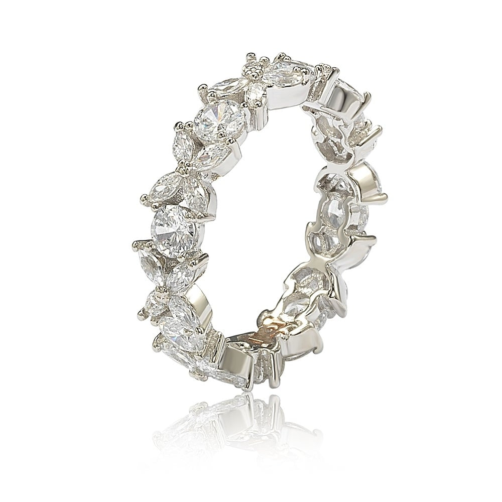 Bring the perfect amount of sparkles on your hand by wearing this beautifully designed multi-cut cubic zirconia floral eternity band. Different, but so perfectly matched together, these different cuts will create that wow effect that your usual black dress can't do on it's own. Show your eternal love and beauty with this timeless floral eternity band, featuring round and marquise-cut white cubic zirconia gemstones, hand set in sterling silver. This ring is designed by Suzy Levian with a message. By creating jewelry that is beautiful inside and out, Suzy Levian's message is revealed through a hidden pink cubic zirconia set in the shank of this ring to empower women to discover their inner strength, power and beauty. Highlighted in rose sterling silver Suzy Levian's SL logo lays inside the gallery of the ring. 'Together we can inspire the world to appreciate the diamond in ourselves.' - Suzy Levian