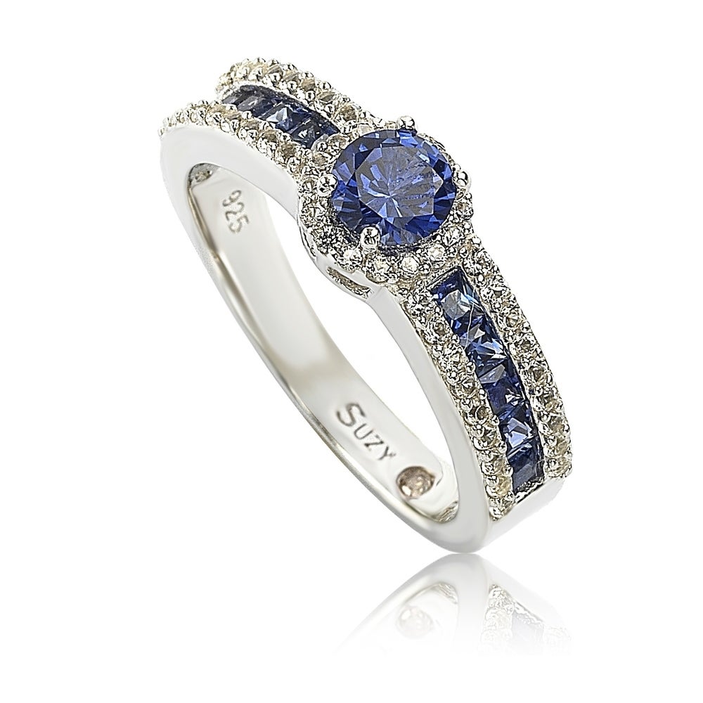 Enjoy sapphire hues with this gorgeous bridal ring featuring a round cut blue sapphire center stone, with a row of princess-cut blue sapphires in a halo of pave-set created white sapphires going down the band. It's the perfect ring for all occasions; rich in color yet classic, center stone with band combined, classic round-cut with modern princess-cut... this will sure to give you multi-use. This ring is designed by Suzy Levian with a message. By creating jewelry that is beautiful inside and out, Suzy Levian's message is revealed through a hidden secret signature diamond (.02ct) set in the shank of this ring to empower women to discover their inner strength, power and beauty. This ring has a closed undergallery with a yellow plated SL logo to highlight Suzy Levian's signature stamp. 'Together we can inspire the world to appreciate the diamond in ourselves.' - Suzy Levian