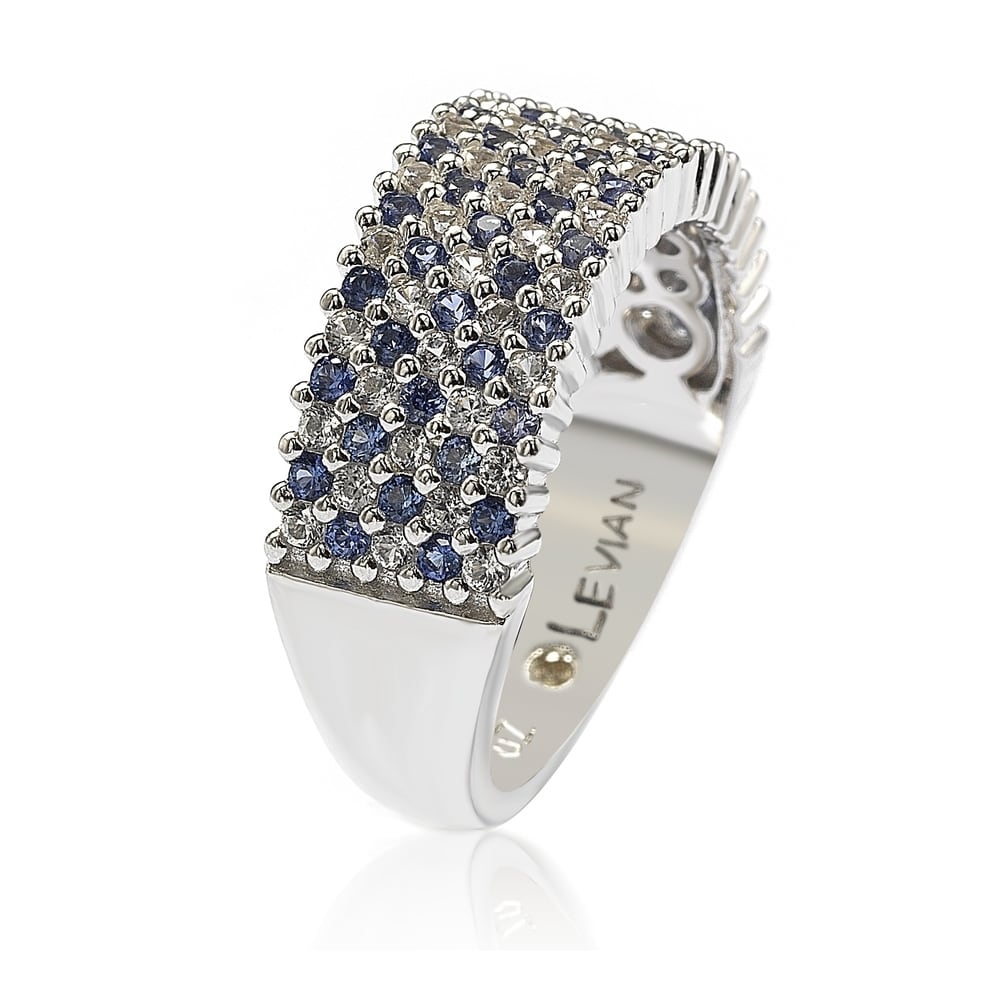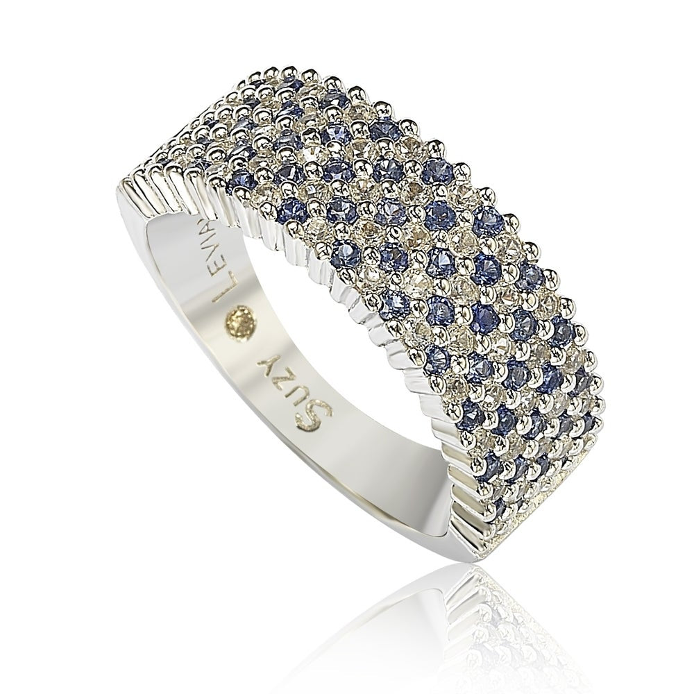 This gorgeous ring features a criss-cross pattern of natural blue sapphires and created white sapphires going around half way down the band, pave-set in sterling silver. This ring is designed by Suzy Levian with a message. By creating jewelry that is beautiful inside and out, Suzy Levian's message is revealed through her hidden brown diamond set in the shank of this ring to empower women to discover their inner strength, power and beauty. This ring has a closed under-gallery for comfort fit with a yellow plated unique designer Suzy Levian gallery and SL logo. 'Together we can inspire the world to appreciate the diamond in ourselves.' - Suzy Levian