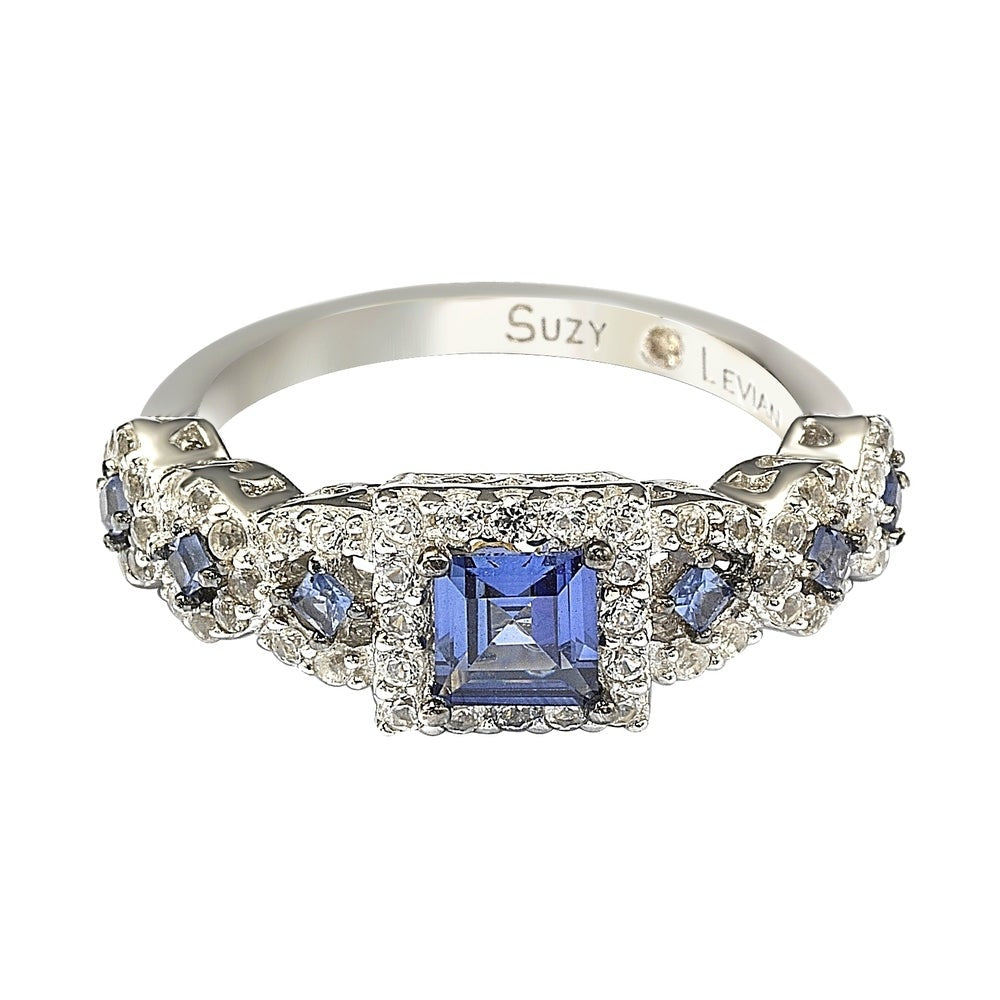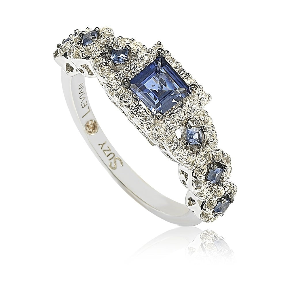 Embrace a modern twist on an all-time classic bridal style. A rich blue asscher cut natural sapphire gemstone is prong-set in the center with smaller diamond-cut blue sapphires set along the band, surrounded by a crossover halo of created white sapphires. These gems are all individually hand set in sterling silver, with a unique designer two-tone Suzy Levian gallery to create a beautiful ring inside and out. This ring is designed by Suzy Levian with a message. By creating jewelry that is beautiful inside and out, Suzy Levian's message is revealed through a hidden brown diamond (.02 ct) set in the shank of this ring to empower women to discover their inner strength, power and beauty. This ring has a closed under-gallery for comfort fit with a unique yellow plated Suzy Levian's SL logo. 'Together we can inspire the world to appreciate the diamond in ourselves.' - Suzy Levian