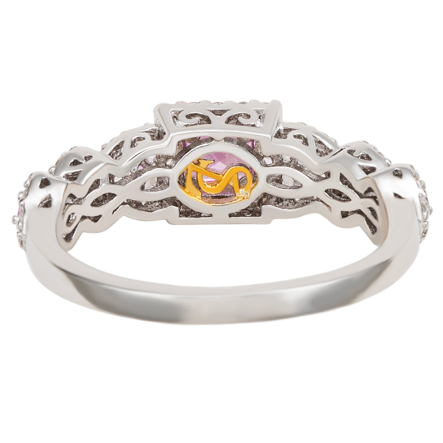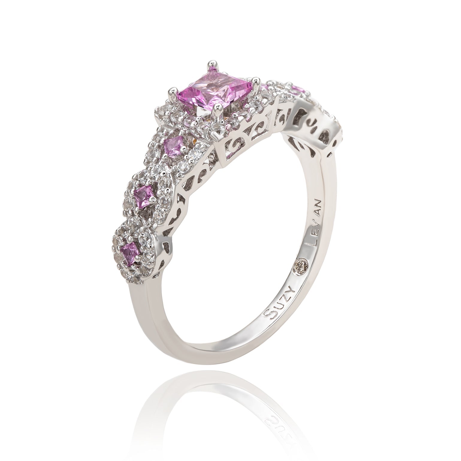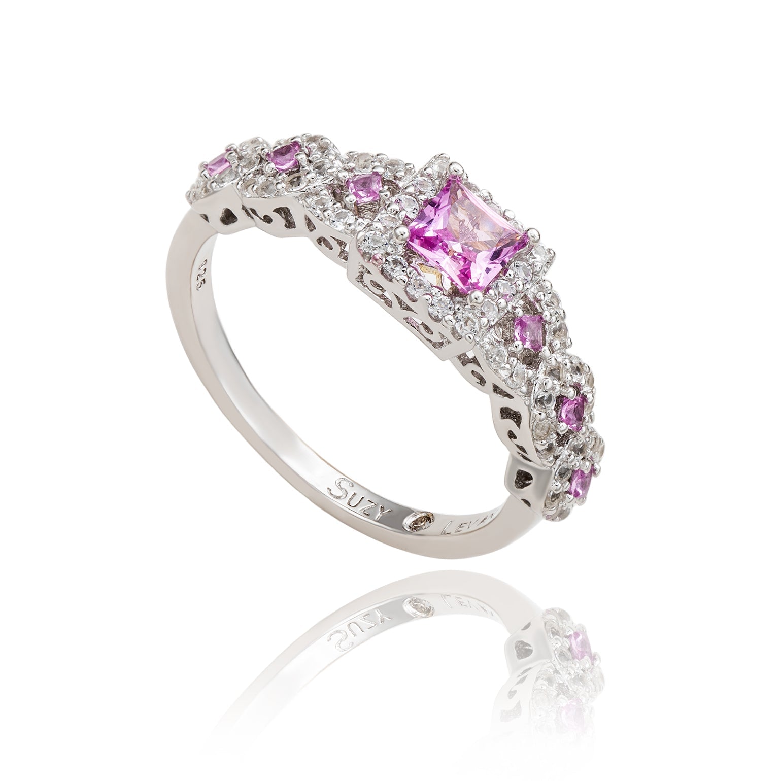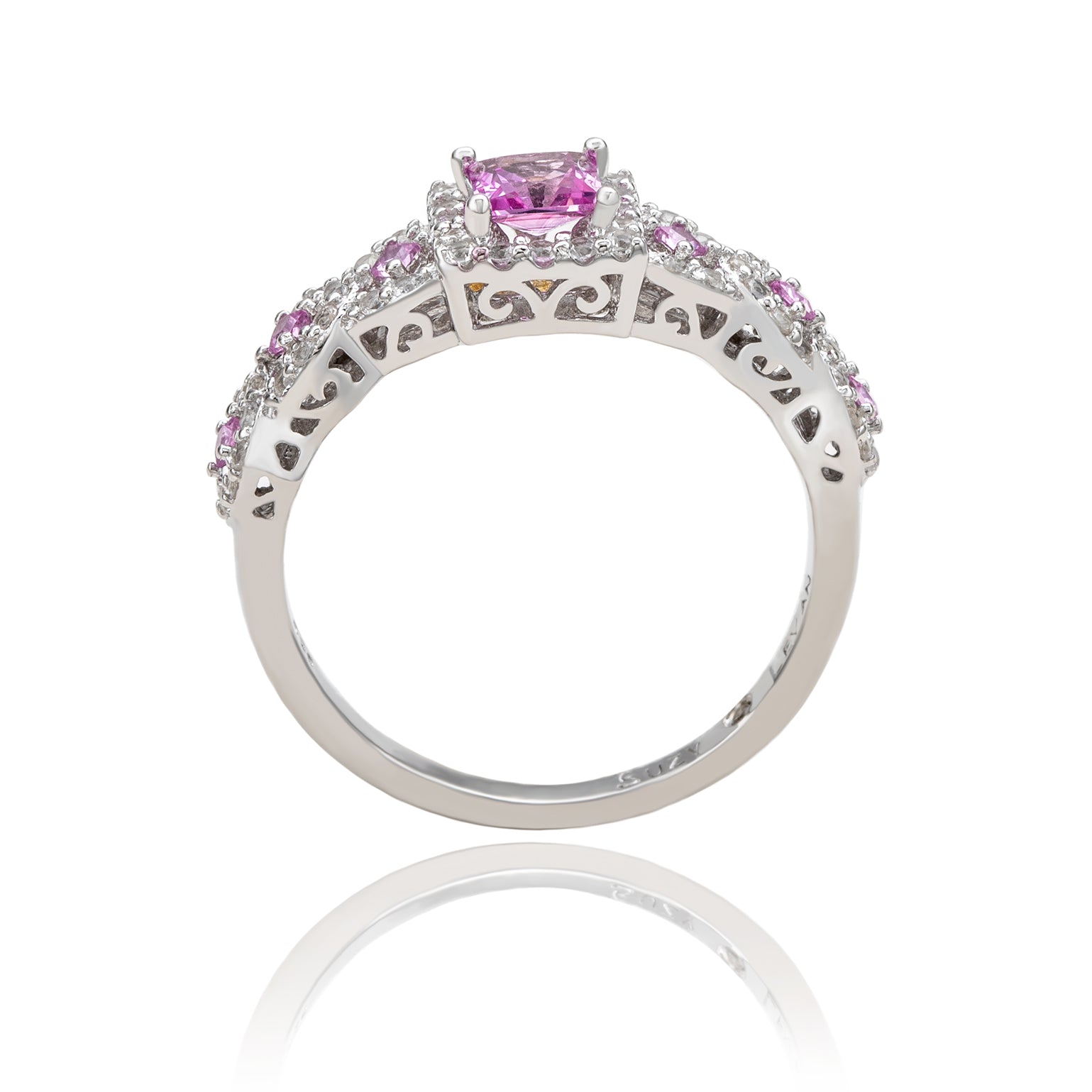Embrace a modern twist on an all-time classic bridal style. A rich pink asscher cut natural sapphire gemstone is prong-set in the center with smaller diamond-cut pink sapphires set along the band, surrounded by a crossover halo of created white sapphires. These gems are all individually hand set in sterling silver, with a unique designer two-tone Suzy Levian gallery to create a beautiful ring inside and out. This ring is designed by Suzy Levian with a message. By creating jewelry that is beautiful inside and out, Suzy Levian's message is revealed through a hidden brown diamond (.02 ct) set in the shank of this ring to empower women to discover their inner strength, power and beauty. This ring has a closed under-gallery for comfort fit with a unique yellow plated Suzy Levian's SL logo. 'Together we can inspire the world to appreciate the diamond in ourselves.' - Suzy Levian