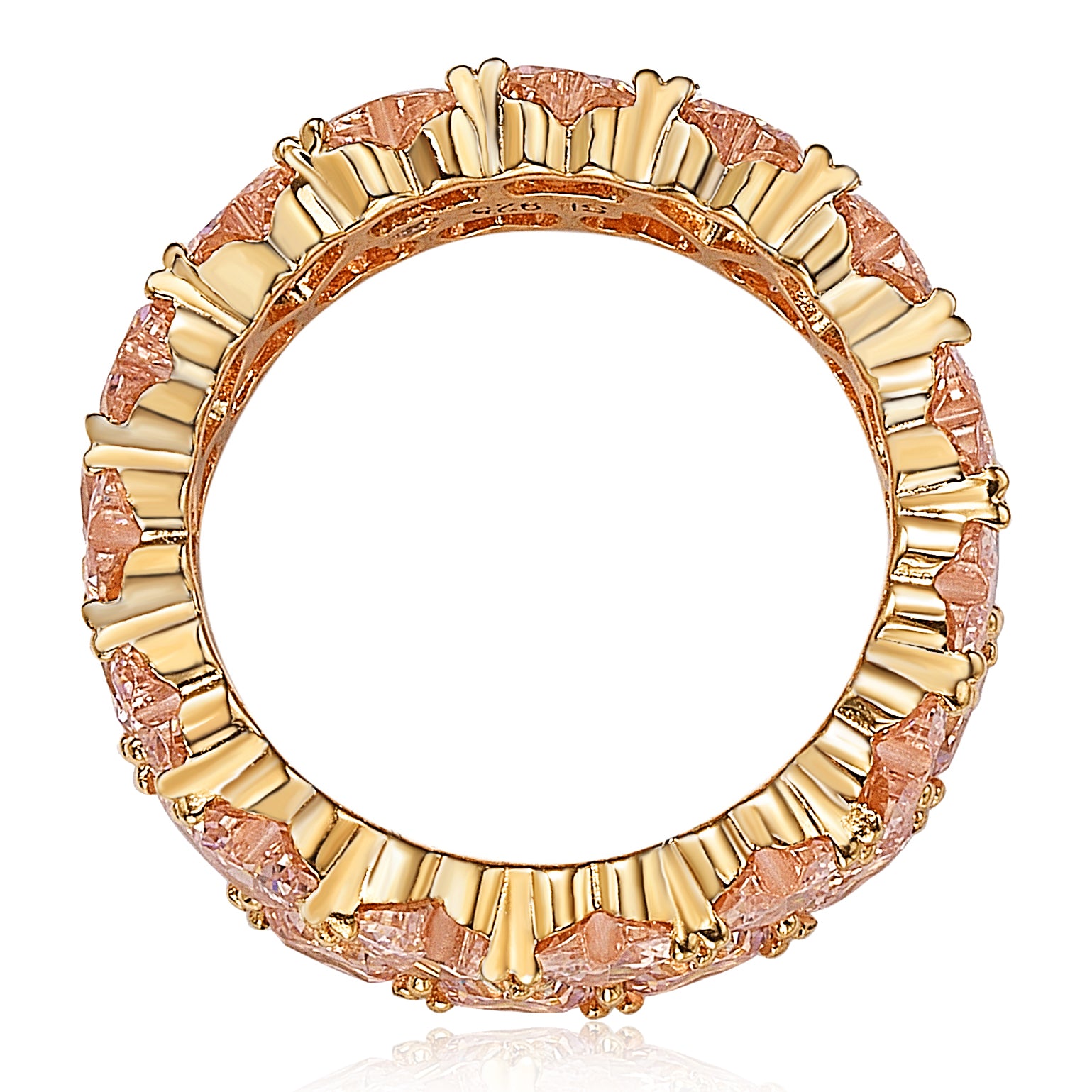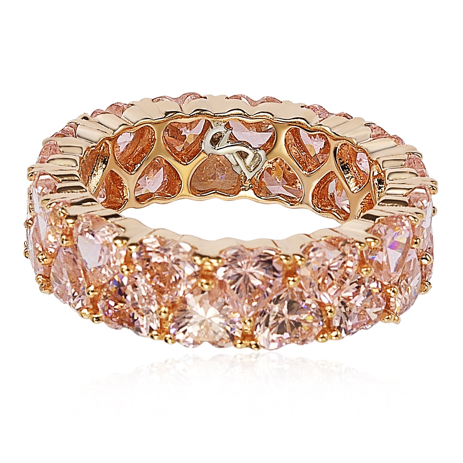 Bring the perfect amount of sparkles on your hand by wearing this beautifully designed, prong-set heart shape cubic zirconia eternity band. Show your eternal love and beauty with this timeless heart shape eternity band, featuring two rows of interlocked heart shape, pink cubic zirconia gemstones, hand set in rosed sterling silver. This ring is designed by Suzy Levian with a message. By creating jewelry that is beautiful inside and out, Suzy Levian's message is revealed through a hidden pink cubic zirconia set on the inside of this ring to empower women to discover their inner strength, power and beauty. Highlighted in sterling silver Suzy Levian's SL logo lays inside the gallery of the ring. 'Together we can inspire the world to appreciate the diamond in ourselves.' - Suzy Levian