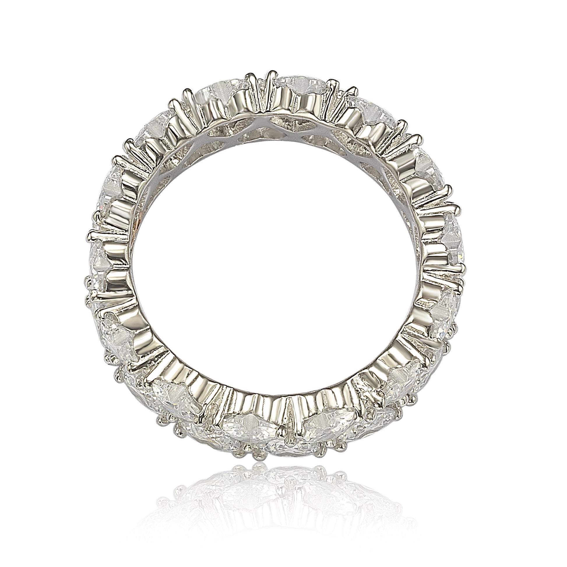 Bring the perfect amount of sparkles on your hand by wearing this beautifully designed, prong-set heart shape cubic zirconia eternity band. Show your eternal love and beauty with this timeless heart shape eternity band, featuring two rows of interlocked heart shape, white cubic zirconia gemstones, hand set in sterling silver. This ring is designed by Suzy Levian with a message. By creating jewelry that is beautiful inside and out, Suzy Levian's message is revealed through a hidden pink cubic zirconia set on the inside of this ring to empower women to discover their inner strength, power and beauty. Highlighted in rose sterling silver Suzy Levian's SL logo lays inside the gallery of the ring. 'Together we can inspire the world to appreciate the diamond in ourselves.' - Suzy Levian