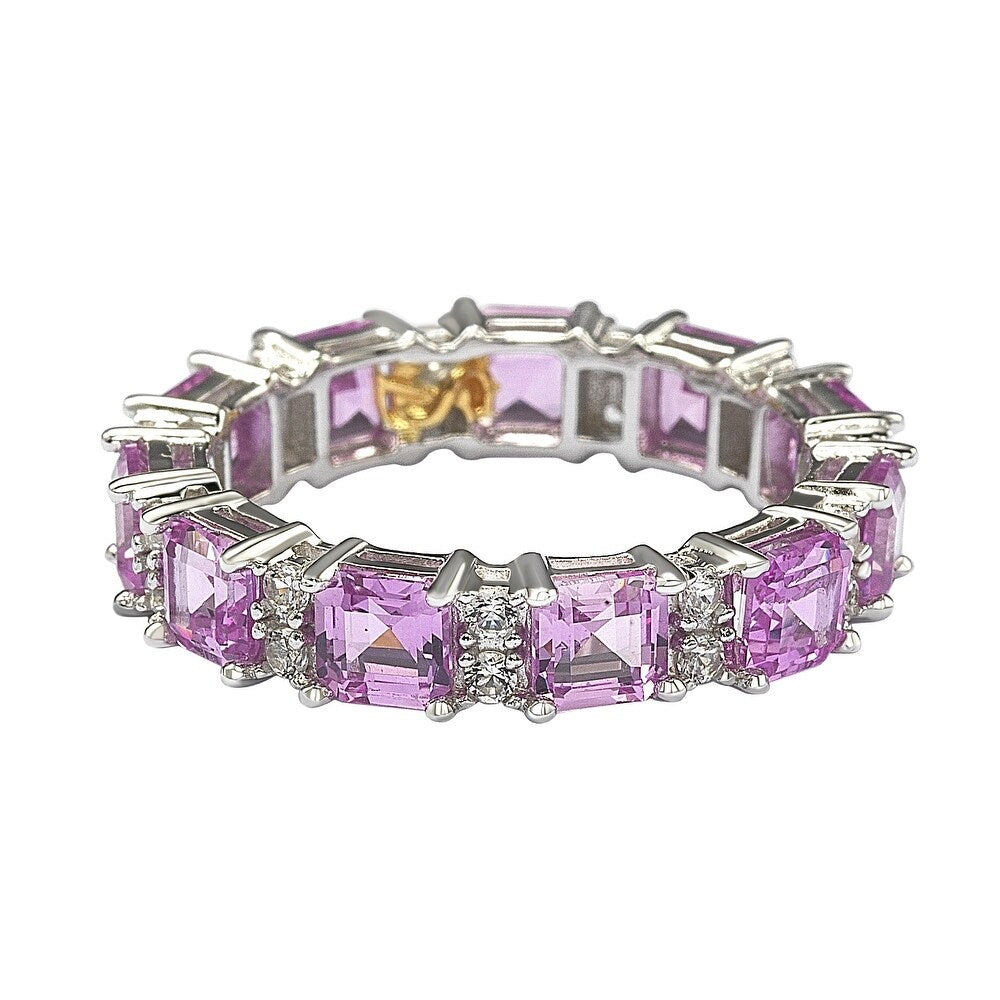 Stunning, timeless and classy eternity band ring. This ring is filled with rich, high quality gemstones, featuring asscher-cut natural pink sapphires, prong-set with alternating smaller round white created white sapphires, hand set in 925 sterling silver. Every single ring is hand made, making it a unique masterpiece. Surprise someone special in your life with this luxurious anniversary ring. Or even better, this could be the perfect birthday gift. Treat someone to a ring that's not only strikingly gorgeous but reminds your special someone that your love will lasts for all eternity. This ring is designed by Suzy Levian with a message. By creating jewelry that is beautiful inside and out, Suzy Levian's message is revealed through a hidden brown fancy diamond (.02 ct) set inside the band of this ring to empower women to discover their inner strength, power and beauty. This ring has a closed under-gallery for comfort fit with a two-tone finish, highlighting Suzy Levian's SL logo. 'Together we can inspire the world to appreciate the diamond in ourselves.' - S.L.