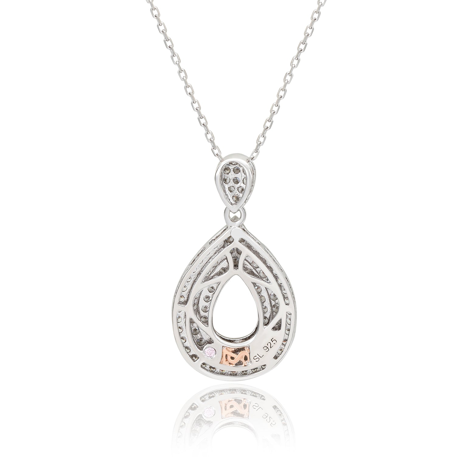 Sweet style and tasty elegance best describes this pendant featuring sparkling white cubic zirconia gemstones, dangling across a buckle of white cubic zirconias. An elegant teardrop shaped pendant boasts rows of shining white cubic zirconia gemstones. The Suzy Levian brand guarantees the finest craftsmanship and confirm that each and every item has been subjected to the most exacting quality control. As well as being designed through breathtaking details on the outside, this pendant is designed by Suzy Levian with a special message to share. By creating jewelry that is beautiful inside and out, Suzy Levian's message is revealed through a hidden stone set in the back of this pendant meant to empower women to discover their inner strength, power and beauty that is hidden within themselves. Hand set in sterling silver, this pendant features a two-tone SL logo in the back. Comes with a complimentary 18" sterling silver chain.
