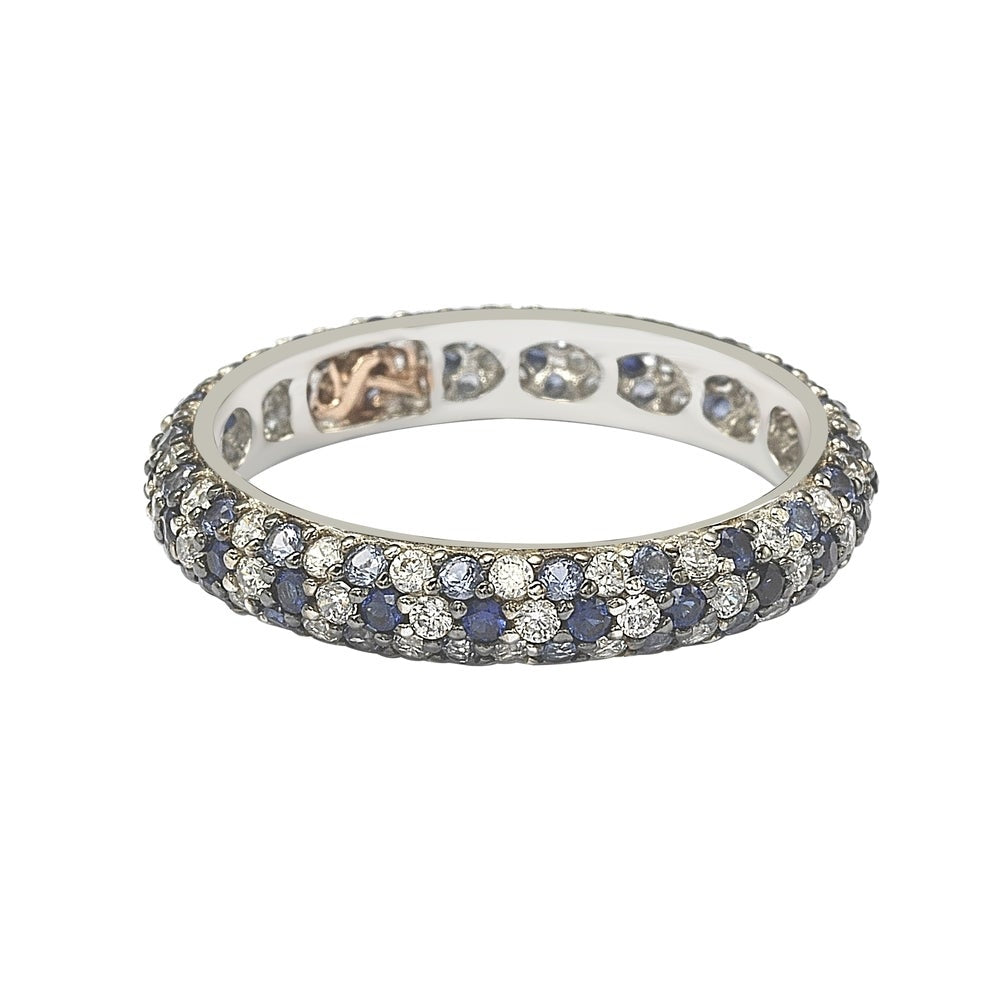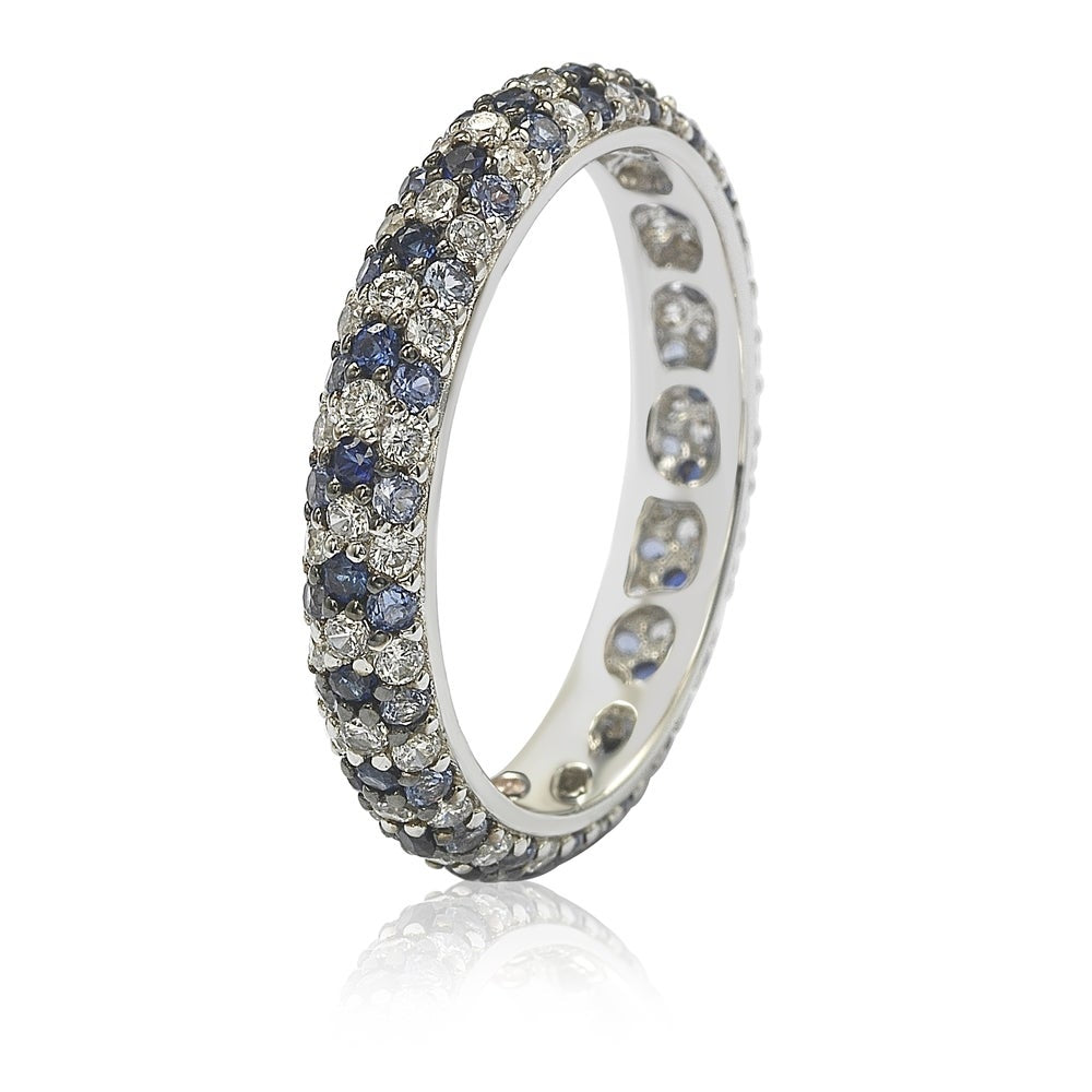 Enjoy beachy blues all year long with sapphire hues. A mix of pave natural blue sapphires and created white sapphires create a multi color band set in sterling silver. It's the perfect accent band to any sapphire ring, or perfectly sparkling all on it's own. This ring is designed by Suzy Levian with a message. By creating jewelry that is beautiful inside and out, Suzy Levian's message is revealed through a hidden secret signature diamond (.02ct) set in the shank of this ring to empower women to discover their inner strength, power and beauty. This ring has a closed under-gallery with a golden SL logo to highlight Suzy Levian's signature stamp. 'Together we can inspire the world to appreciate the diamond in ourselves.' - S.L.