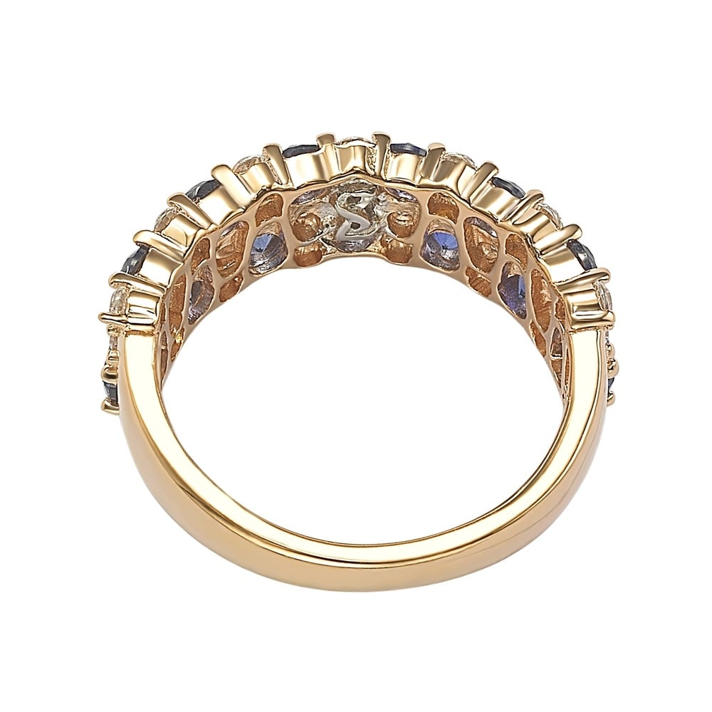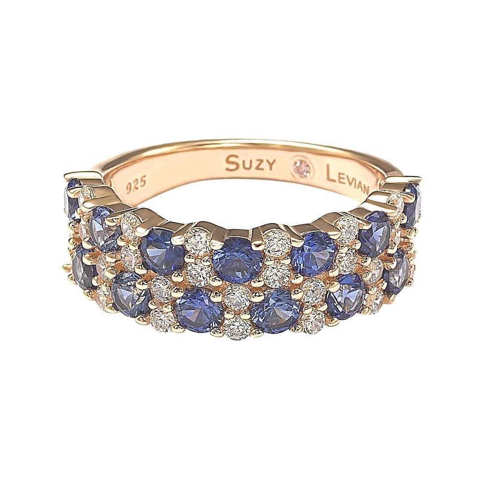 Make a bold impression with the fashionable look of this Suzy Levian double row sapphire eternity ring. Featuring sparkling larger round cut blue sapphires and two smaller created white sapphire gemstones in an alternating pattern in both rows, all hand set in high polished rose sterling silver setting. Suzy Levian's message is revealed through a hidden secret brown diamond (.02 ct) set in the shank of this ring to empower women to discover their inner strength, power and beauty. Make a bold impression with the fashionable look of this Suzy Levian eternity ring.