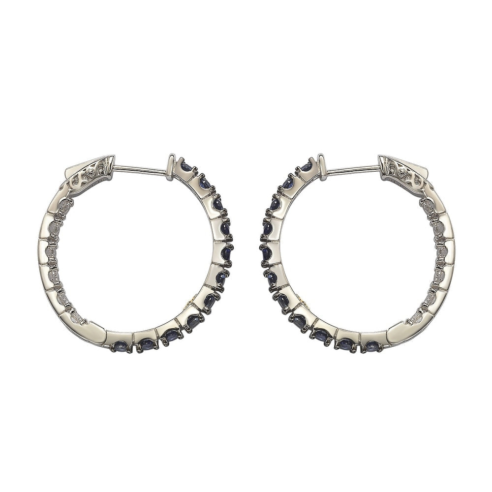 Make a statement with these eye-catching Suzy Levian hoop earrings, perfect for all occasions. These hoop earrings feature a single row of round cut natural blue sapphires and created white sapphire set in 925 sterling silver. These hoops are crafted of sparkling natural blue sapphire going down the outside and created white sapphires on the inside of the hoops to sparkle and shine from every angle. These hoops are secured with a leverback safety closure keeping them snug and comfortable for a long day at work or a night out with the girls! These hoops will add sparkle and sophistication to your ensemble and is perfect for any occasion!