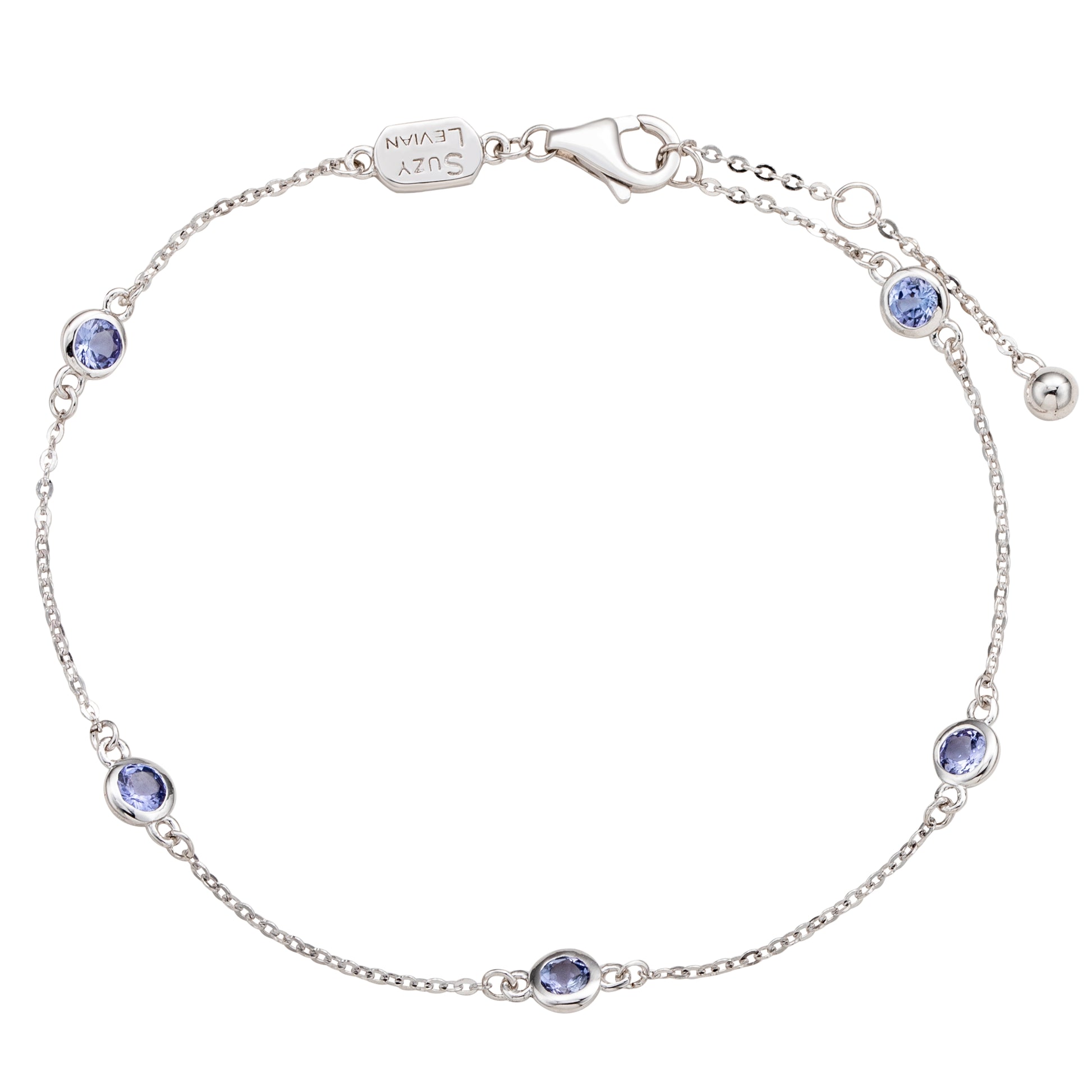 Adorn your hand with sparkling shimmers with this beautiful genuine tanzanite station bracelet. This bracelet can be worn stackable with other bracelets or as a single bracelet, making it the perfect bracelet for every occasion. This bracelet features five round-cut vibrant genuine tanzanite that is a total of .55 cttw, and are bezel set in 14K white gold. This Bracelet is 7" in length, and showcases sparkle & shine from every angle. This bracelet has a spring ring closure with a unique plaque embracing Suzy Levian's 14K yellow gold SL logo. By creating jewelry that is beautiful inside and out. A high polish finish completes the look. This makes a great gift to give for a special loved one on any occasion, such as graduation, birthdays, holiday gift, bat- mitzvahs, and anniversaries!