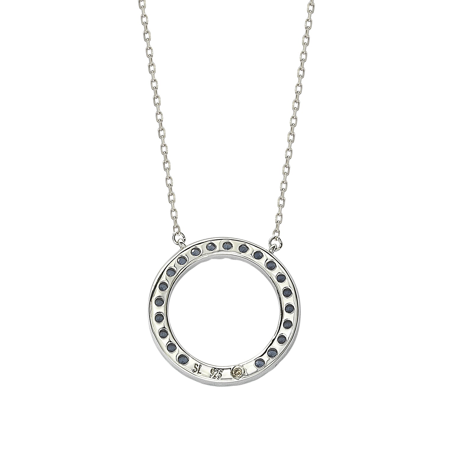 This elegant Suzy Levian pendant features round cut blue cubic zirconias to create a gorgeous eternity circle, all set in black rhodium plated sterling silver. The pendant is hung across an 18'' inch sterling silver cable chain and is secured with a spring ring clasp. It's subtle design flaunts your simple yet sophisticated style. This pendant is designed by Suzy Levian with a message. By creating jewelry that is beautiful inside and out, Suzy Levian's message is revealed through a hidden pink cubic zirconia set in the back of this pendant to empower women to discover their inner strength, power and beauty. 'Together we can inspire the world to appreciate the diamond in ourselves.' - S.L. This makes a great gift to give for a special loved one on any occasion, such as a graduation, birthday, holiday gift, bat- mitzvah or anniversary!