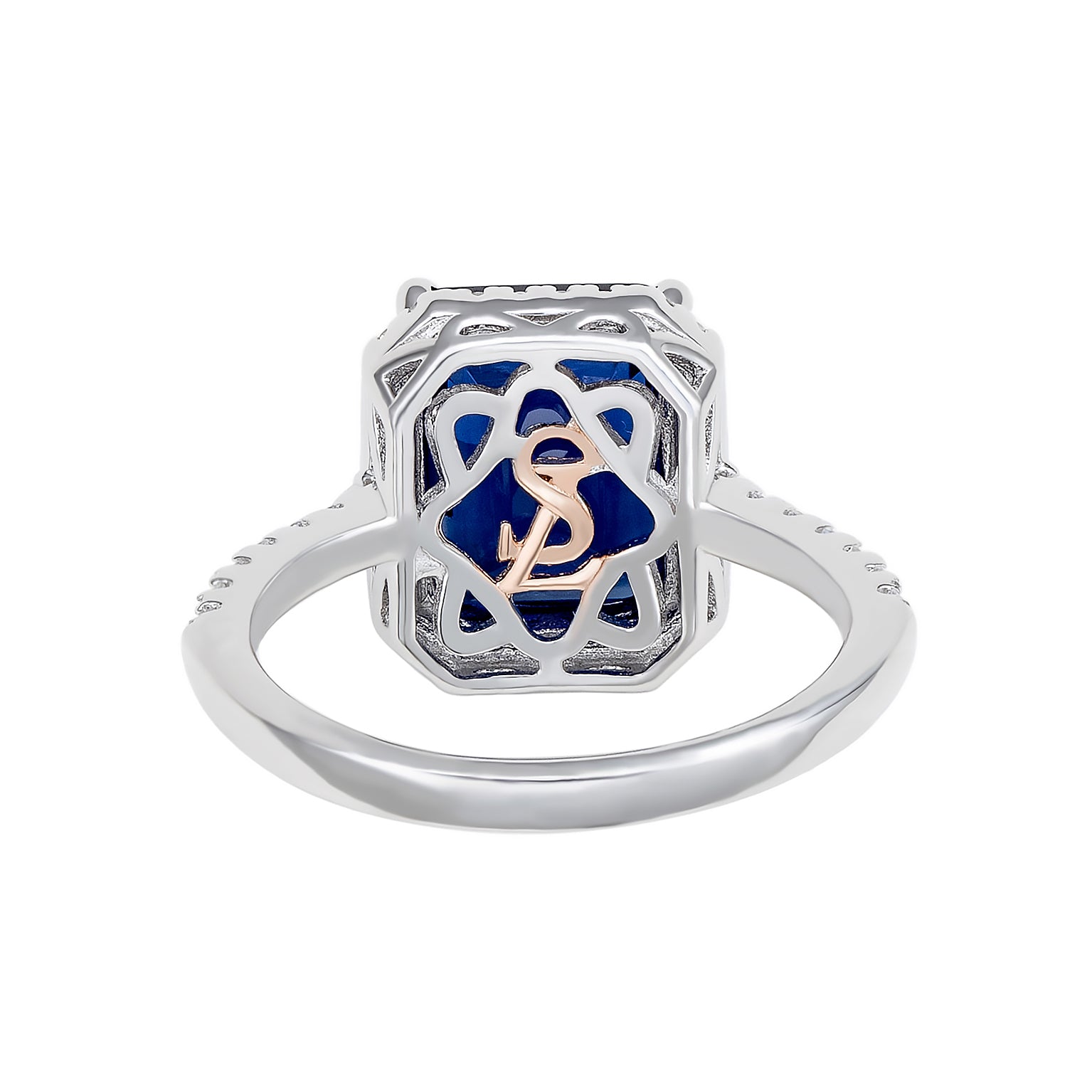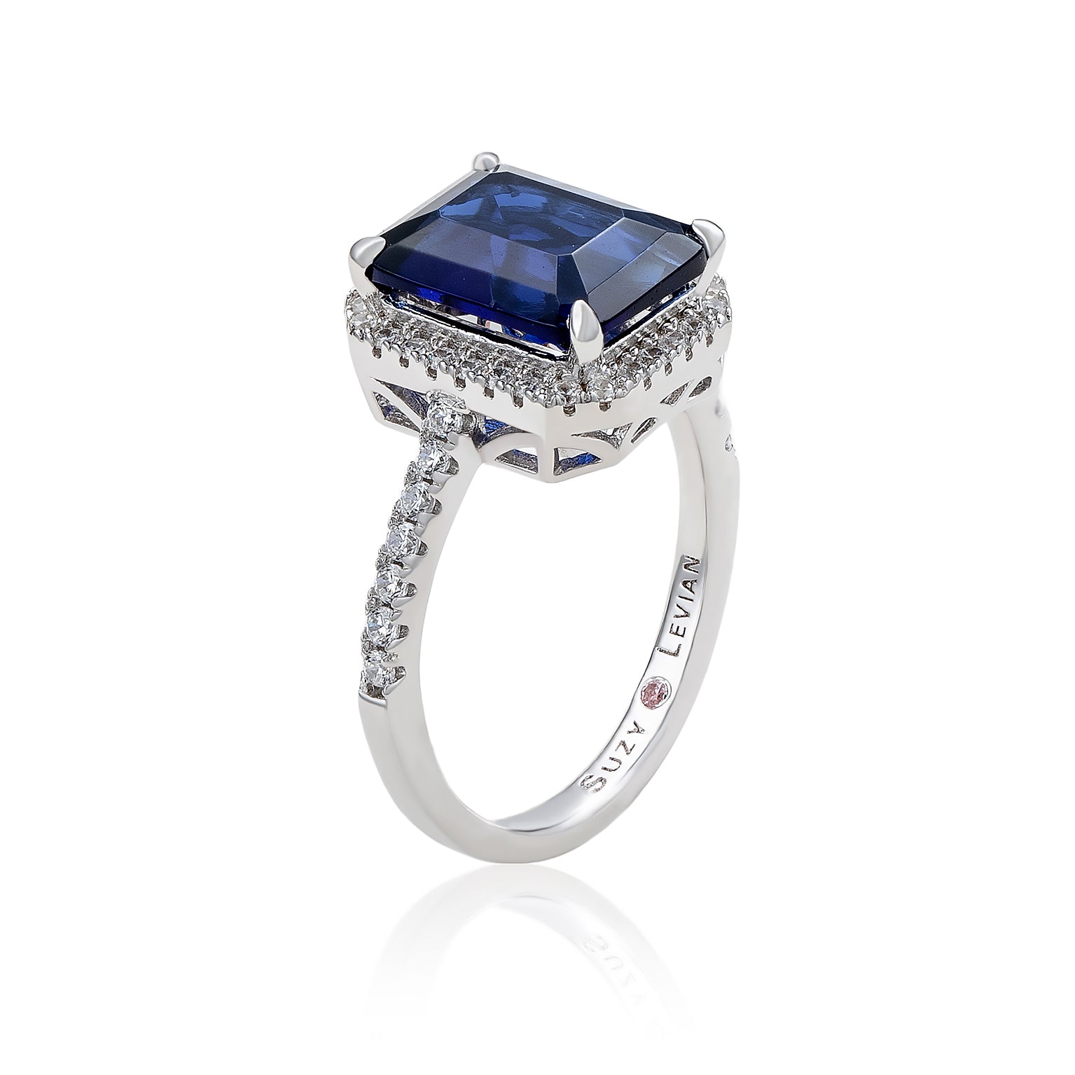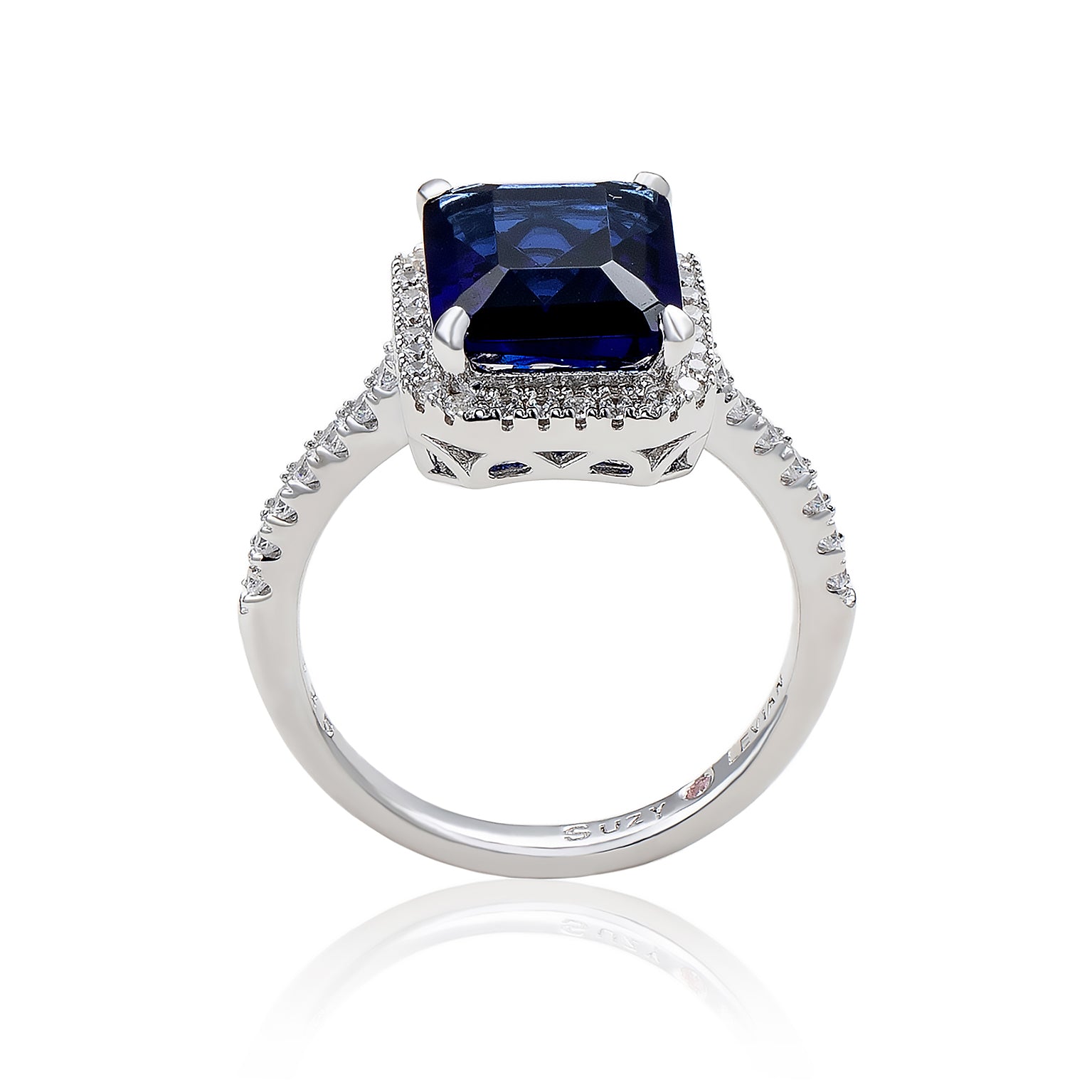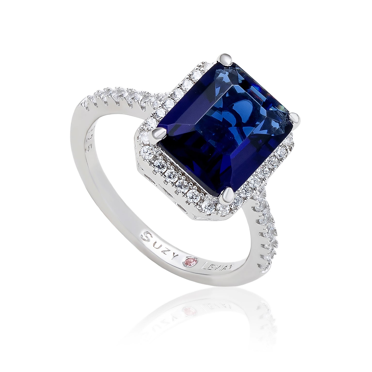 This sophisticated ring features a large emerald-cut blue cubic zirconia center stone with a white cubic zirconia halo. Going down the band of this ring there are white cubic zirconia's, hand-set in sterling silver. This ring is designed by Suzy Levian with a message. By creating jewelry that is beautiful inside and out, Suzy Levian 's message is revealed through a hidden stone set in the shank of this ring to empower women to discover their inner strength, power and beauty. This ring has a closed under-gallery with a two tone plating, highlighting Suzy Levian 's SL logo. This glamorous ring is perfect for any special occasion, or a girls night out.